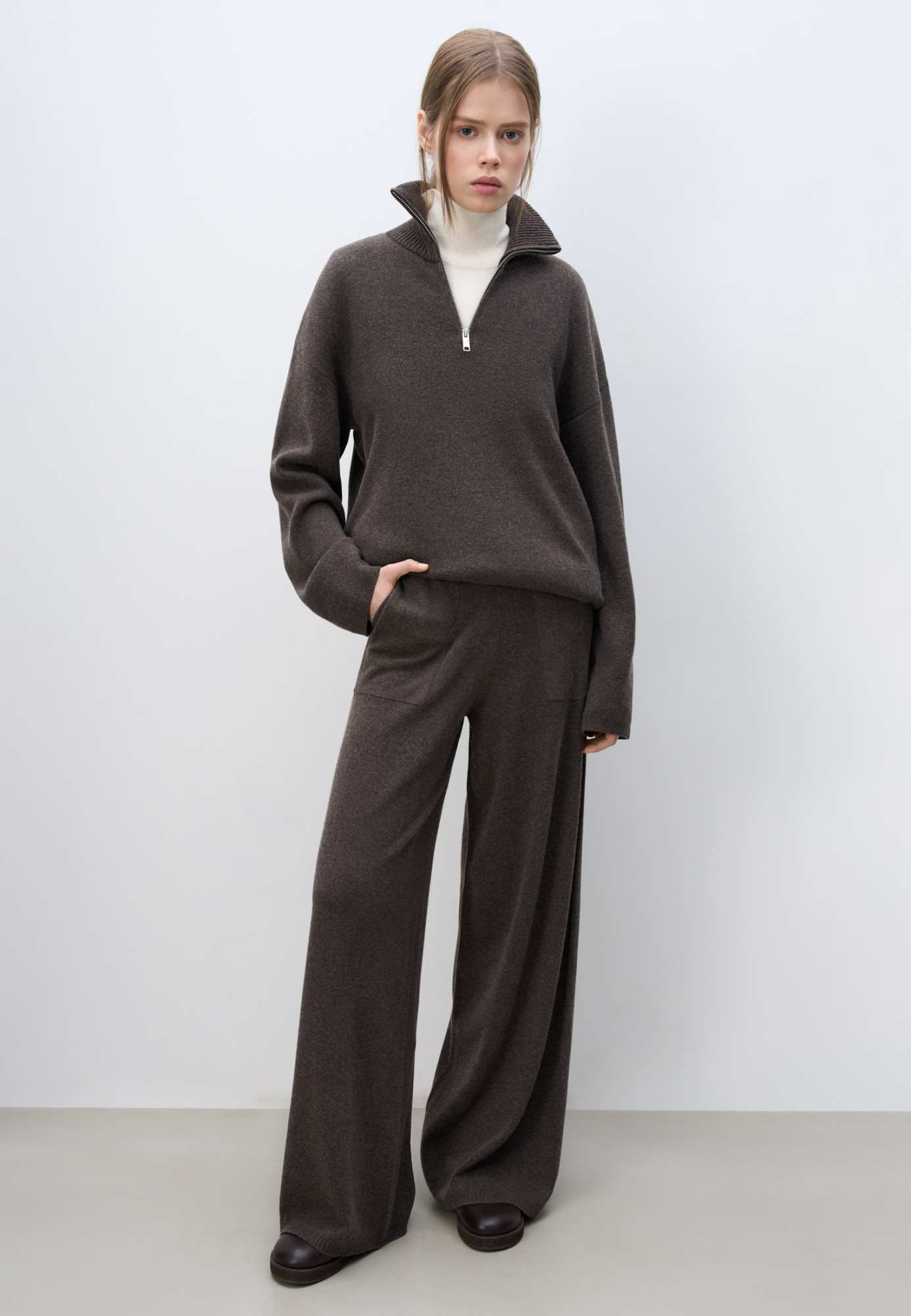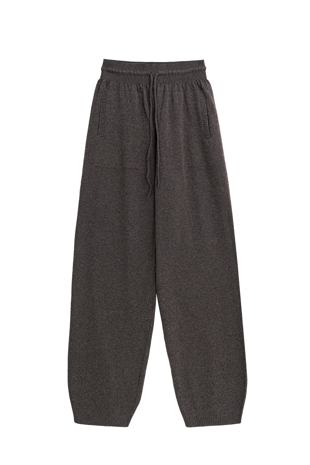 Cashmere and wool knit pants. Wide leg, elastic waistband with drawstring and side pockets.