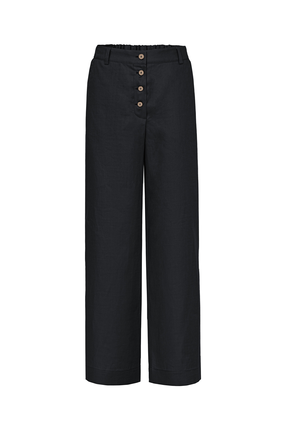 100% linen wide-leg pants. Features a high waist and pockets. Button closure.