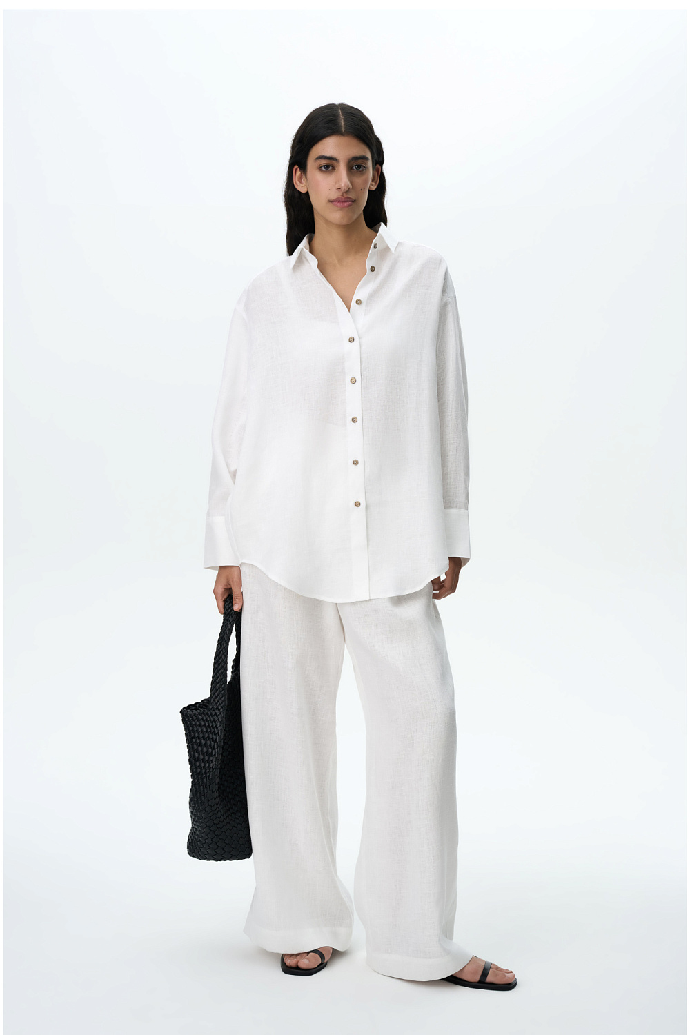Loose-fit trousers made of 100% linen with a high asymmetrical waist.