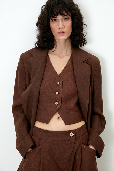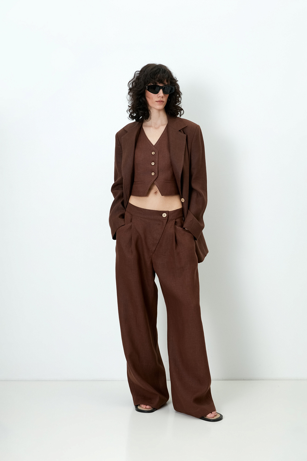 Loose-fit trousers made of 100% linen with a high asymmetrical waist.