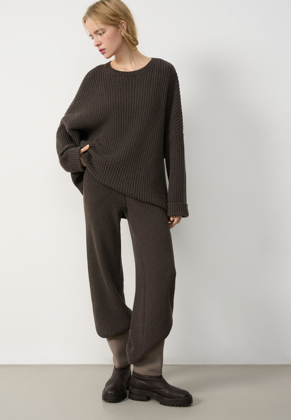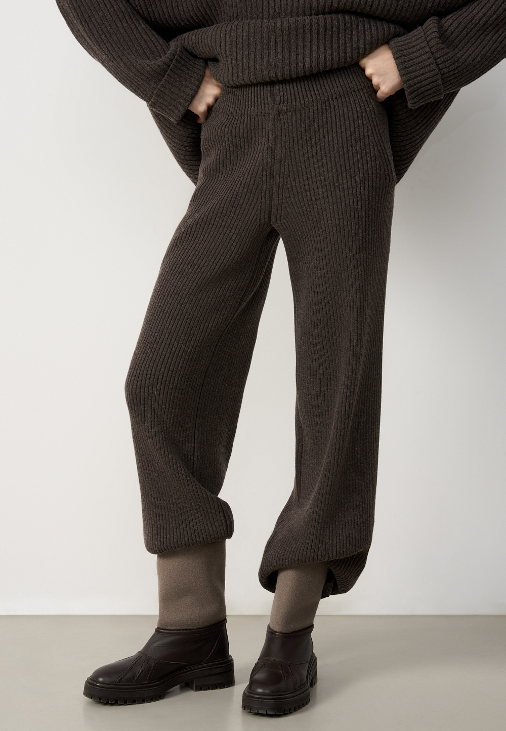 Wide-leg trousers in a wool and cashmere blend. Straight design with side pockets and elastic waistband.
