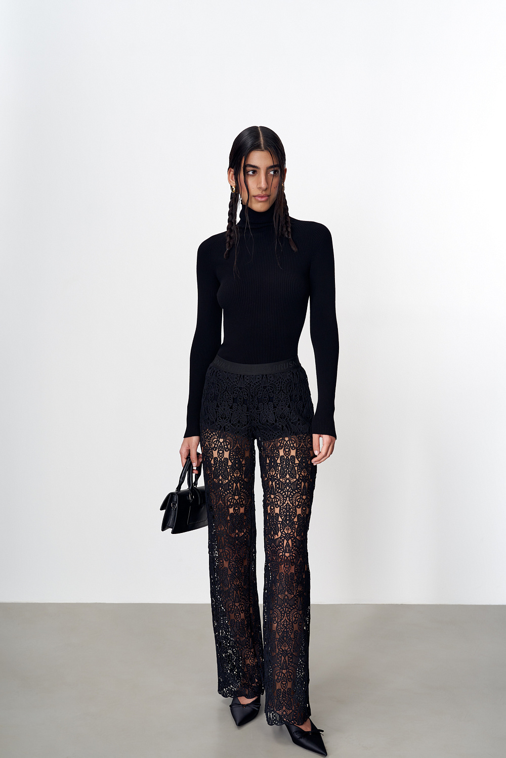 Semi-sheer flared pants with an elasticated waistband and a zip at the back. Made from Italian lace.