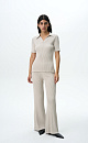 Knitted flared viscose trousers. The model has a fitted silhouette with side pockets and a wide elastic waistband. You can complement the look with a polo T-shirt in the same style.
