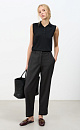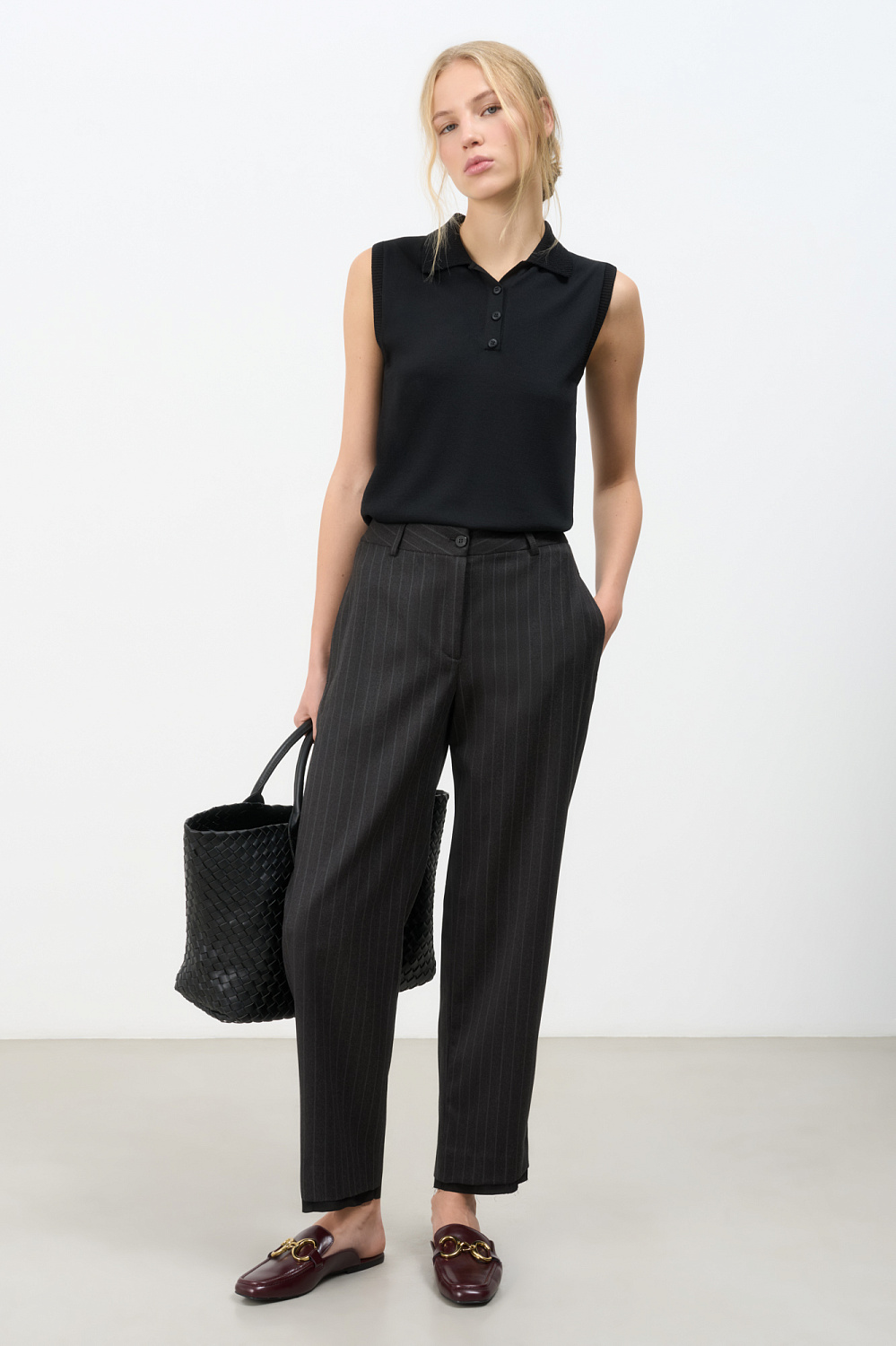 Striped wool trousers. The model has a straight fit, mid-rise, with side and back pockets. Imitation of protruding lining at the bottom of the product. Zip and button closure. You can complement the look with a jacket in the same style.