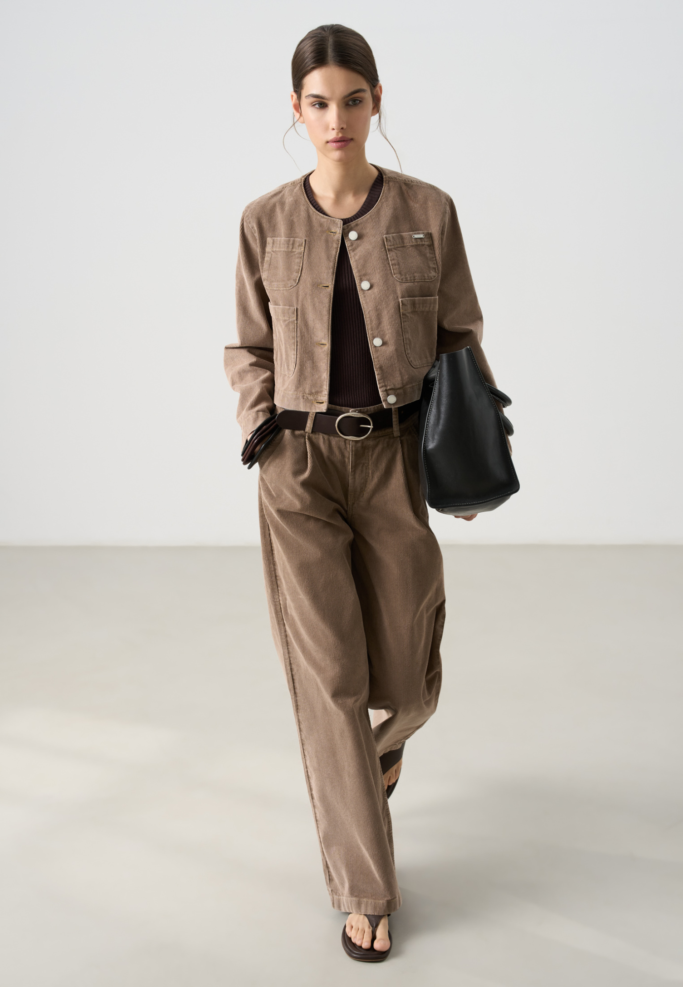 100% cotton corduroy trousers with a high waist. Model with a wide waistband and belt loops; the waistband has an elastic band at the back. Fastening with two metal buttons and a zipper. You can complement the look with a jacket.