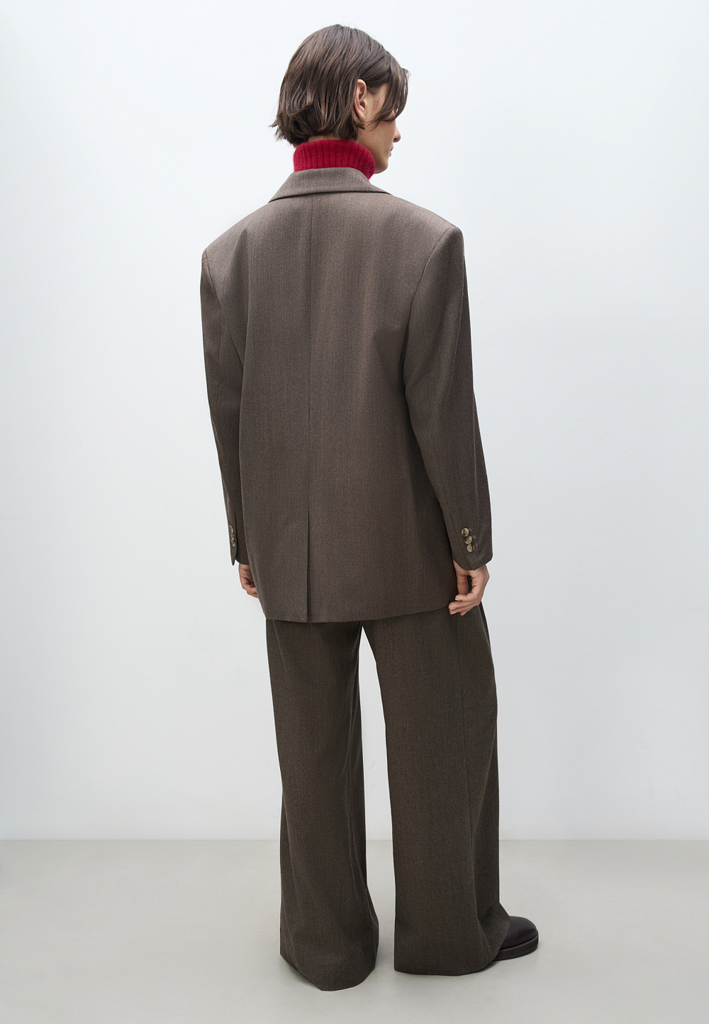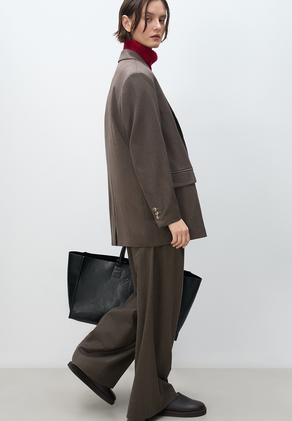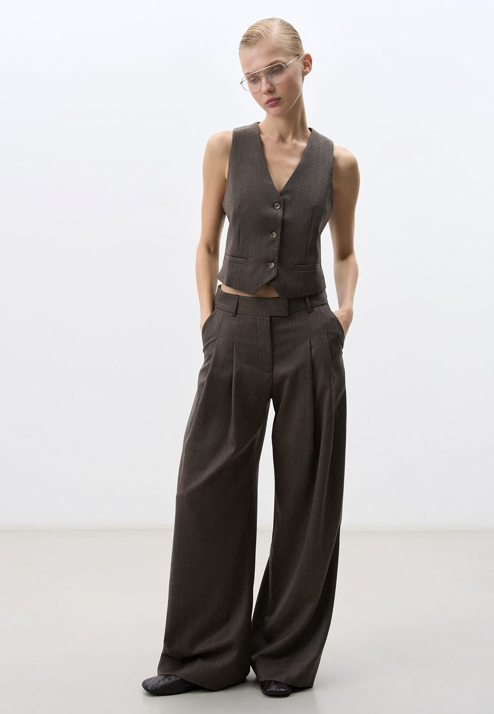 Flannel palazzo pants. The model has a straight, loose silhouette, with side and back pockets. Belt loops on the waistband. Fastening with a zipper, hidden button and trouser hook.