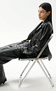Classic trousers made of eco-leather. Straight-cut model with arrows, pockets and patches on the waistband for a belt. Hook and zip fastening.