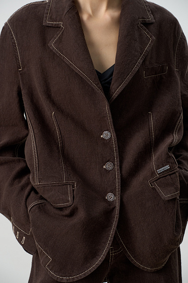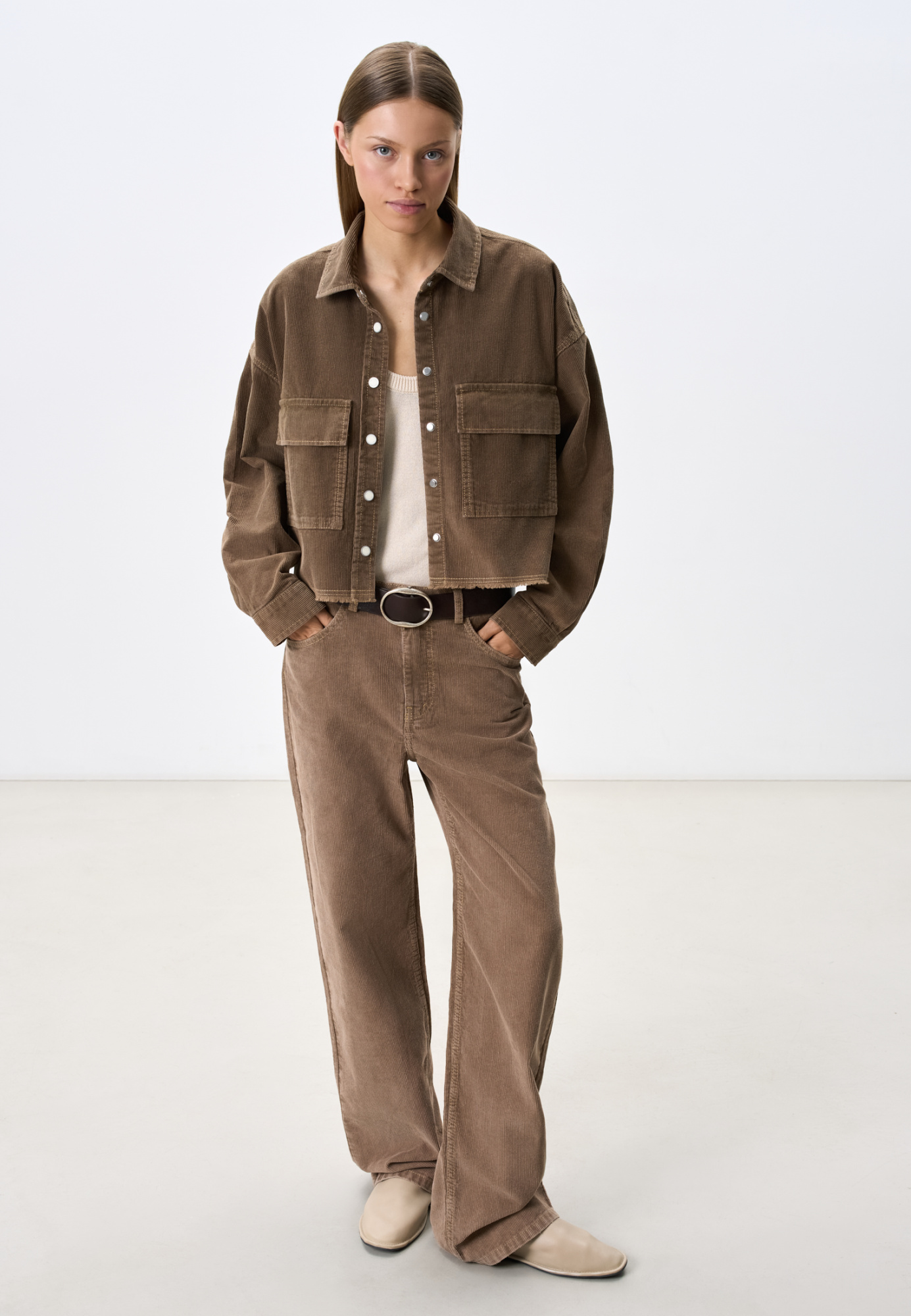 Corduroy trousers made of 100% cotton. The model has a straight cut, five pockets and belt loops on the waistband. Zip and button closure.