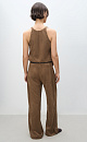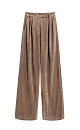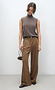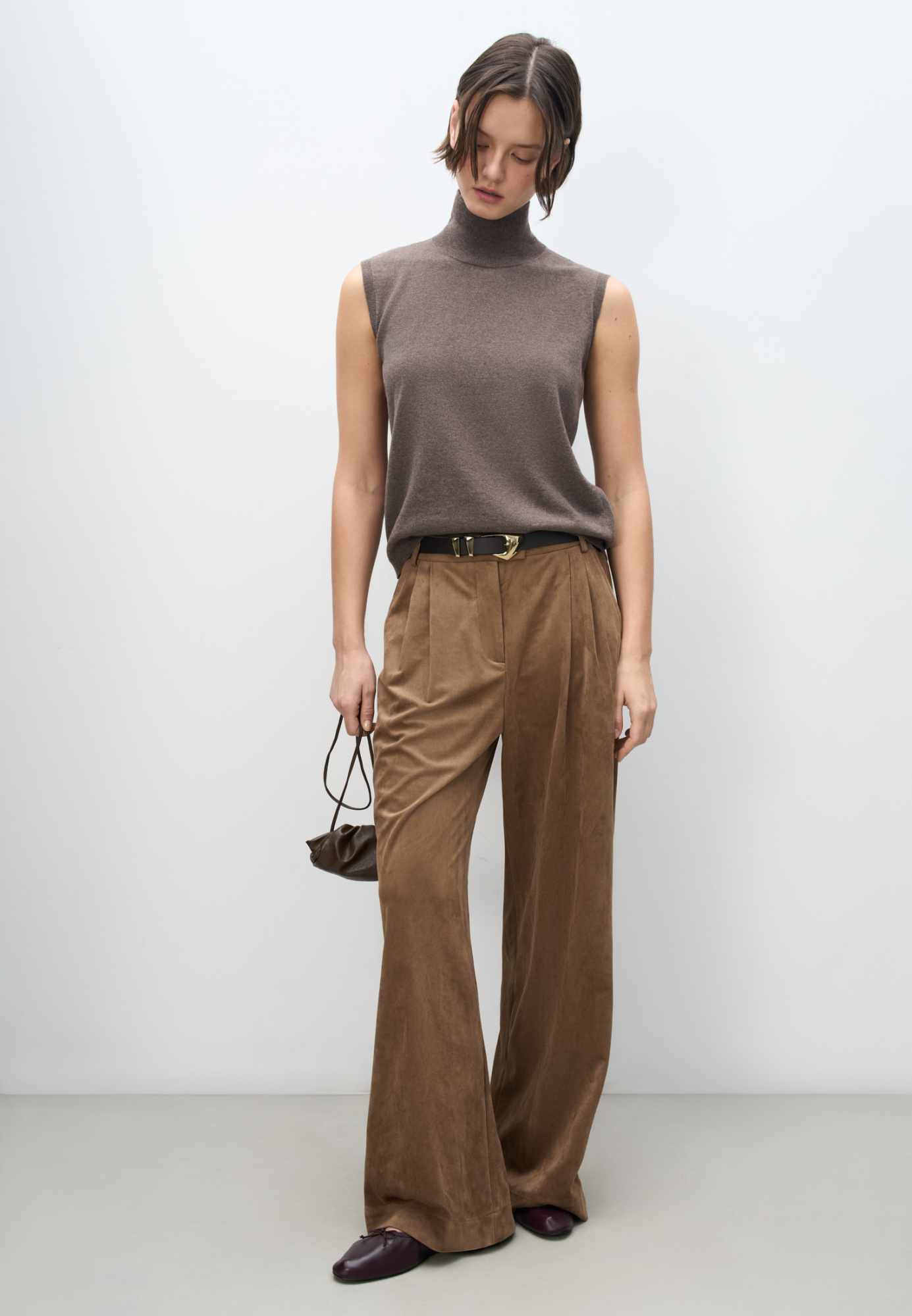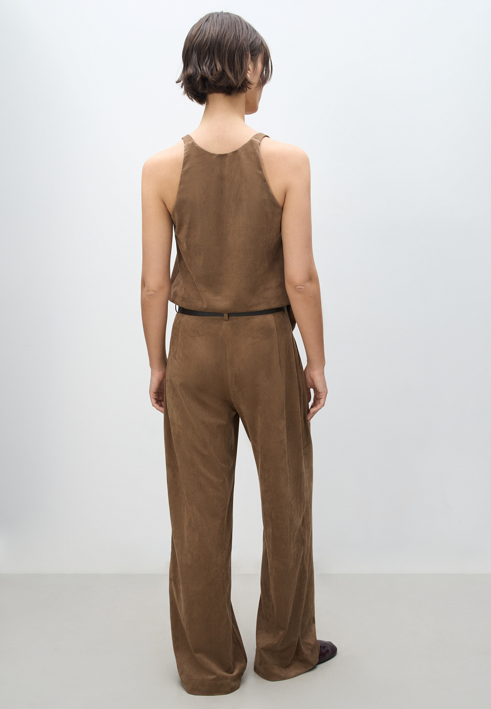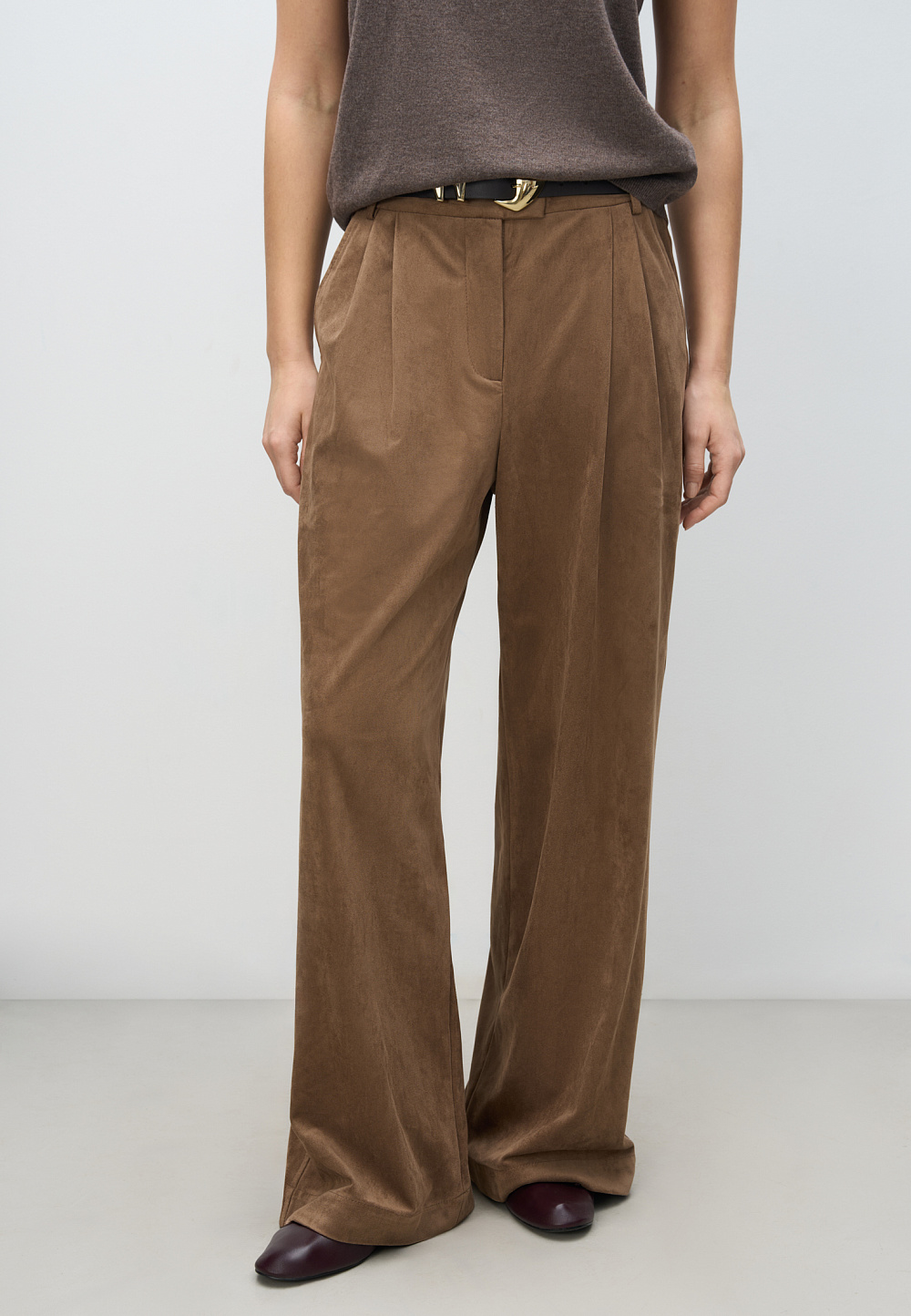 Trousers made of fabric with an imitation of the appearance and properties of natural suede. Model with pintucks at the waist and belt loops on the waistband. Fastening with hidden button and trouser hook. Finished with tone-on-tone stitching.