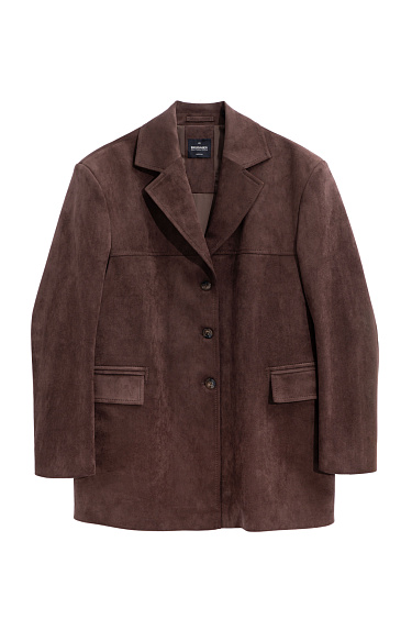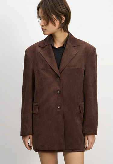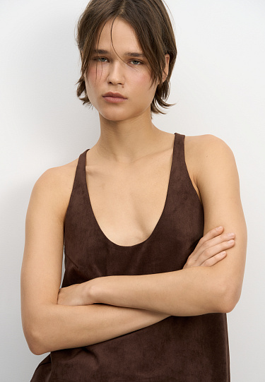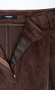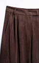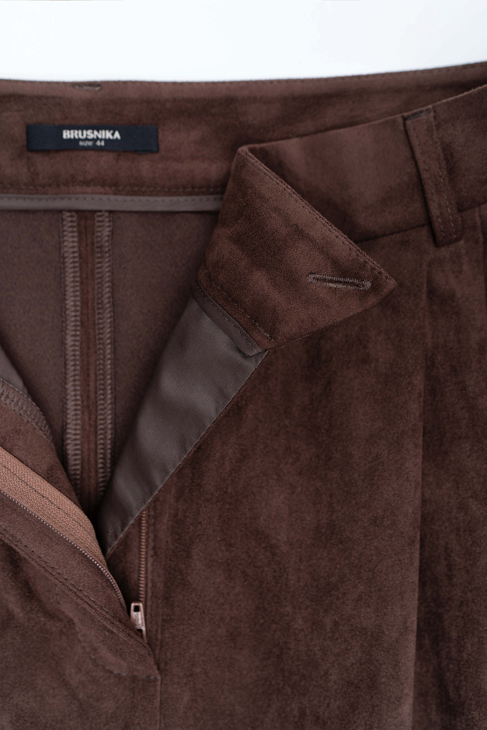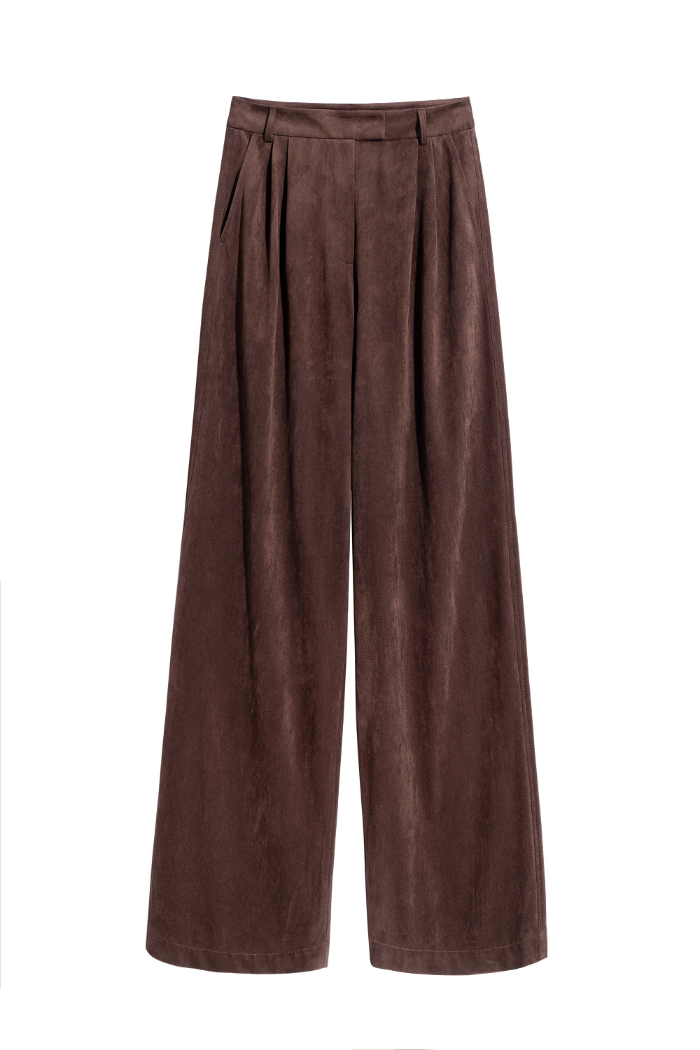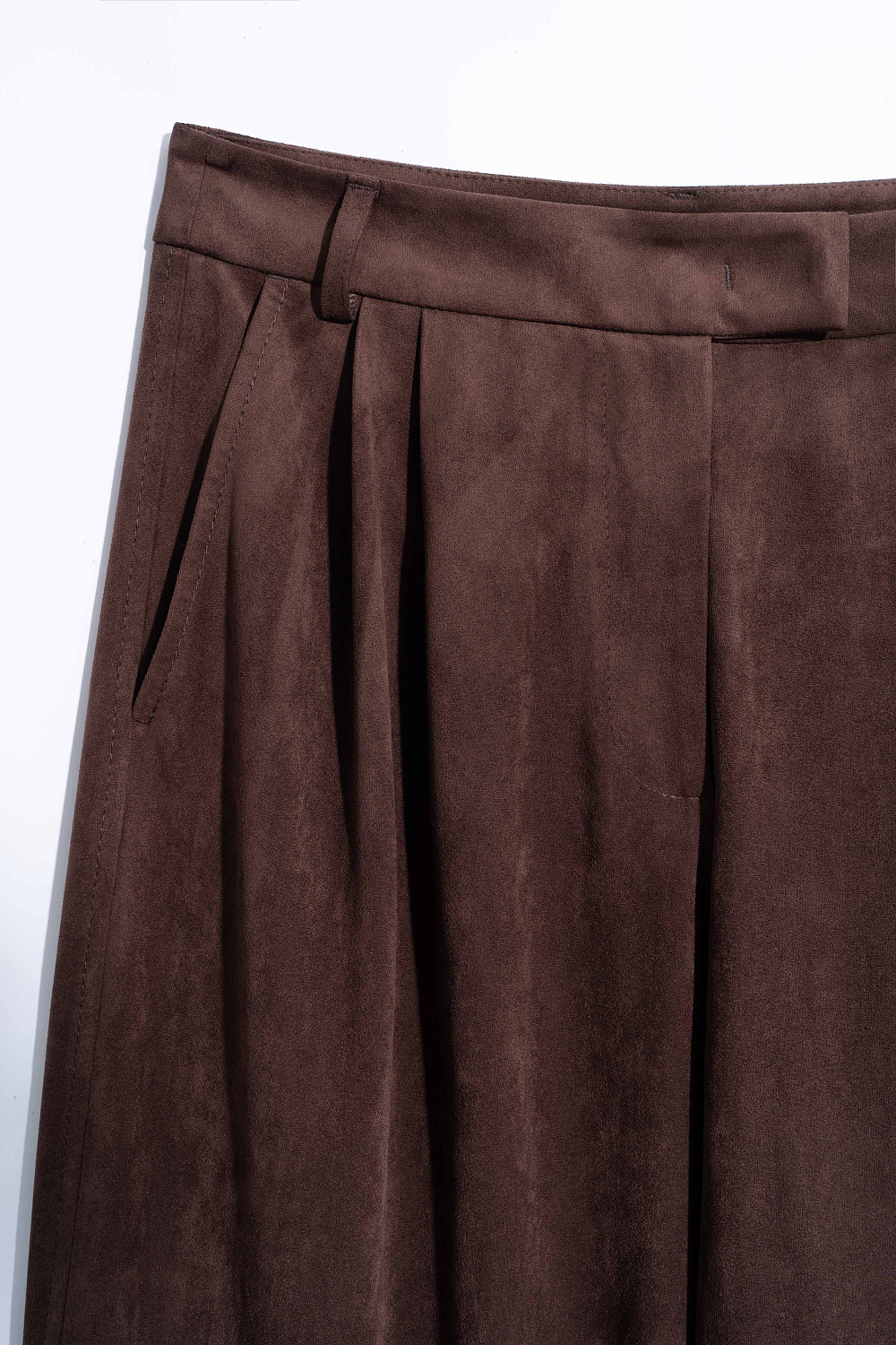 Trousers made of fabric with an imitation of the appearance and properties of natural suede. Model with pintucks at the waist and belt loops on the waistband. Fastening with hidden button and trouser hook. Finished with tone-on-tone stitching.