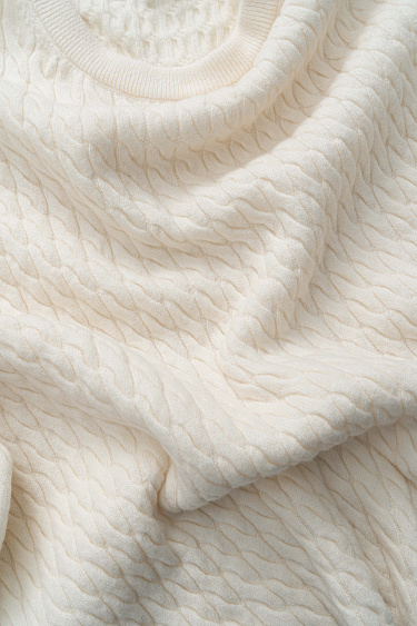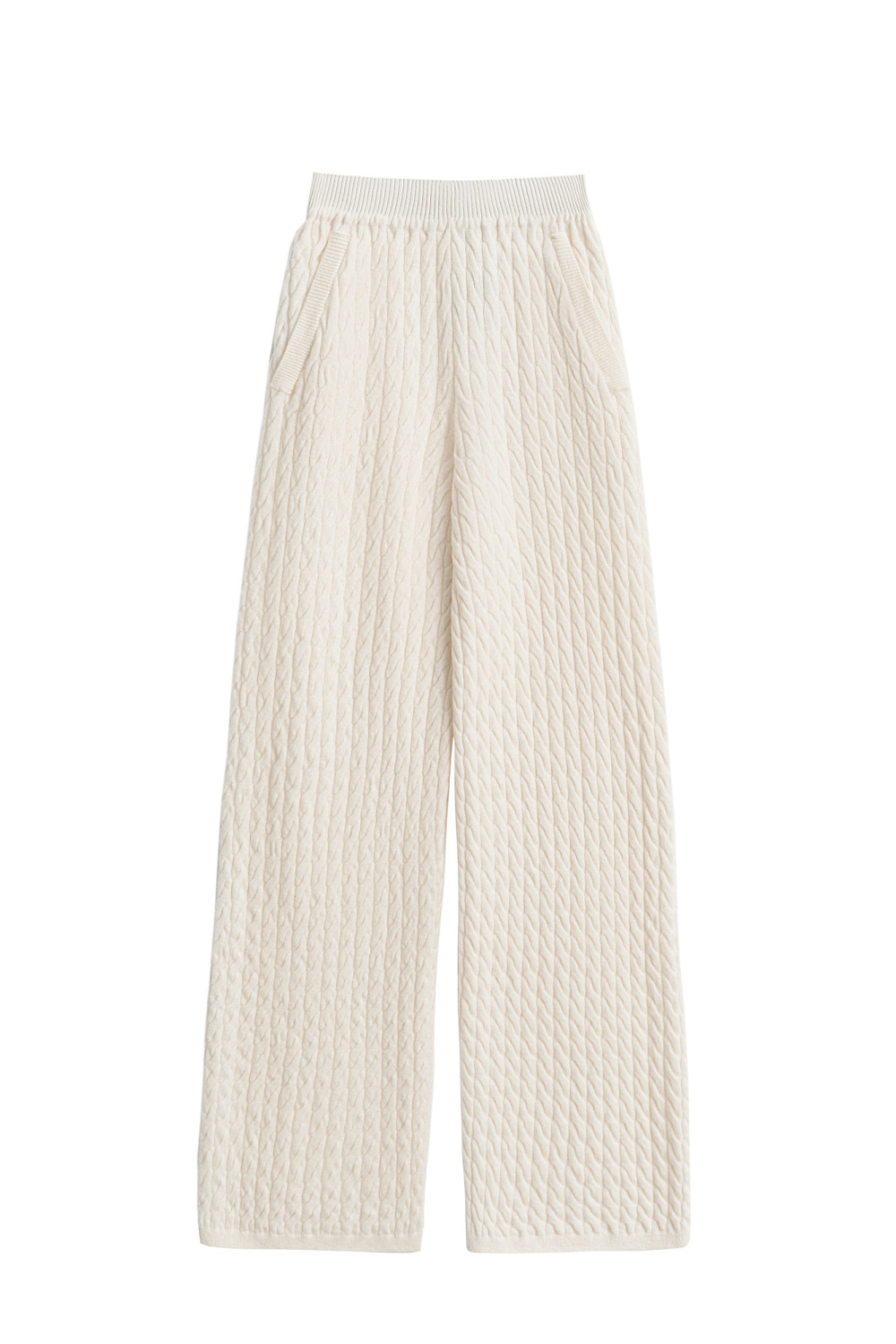 Knitted trousers with voluminous braids made from 100% extrafine merino wool. Model with elastic band and deep side pockets.