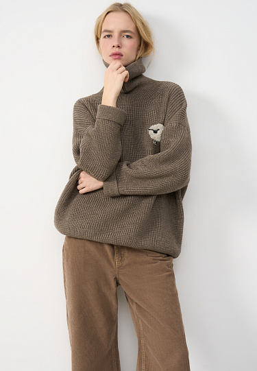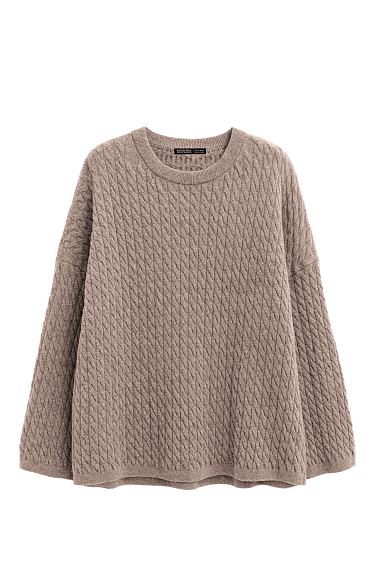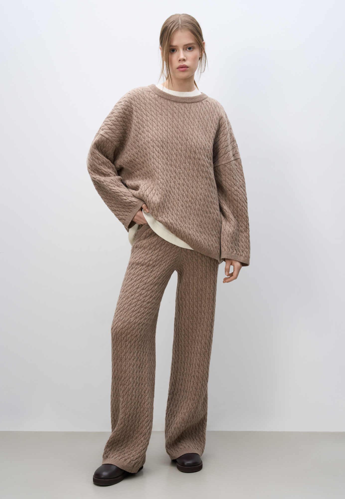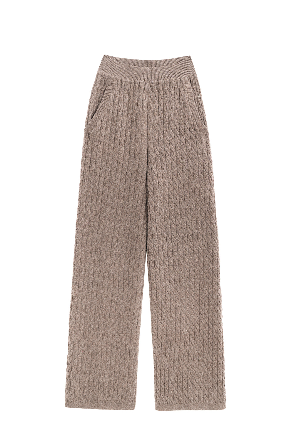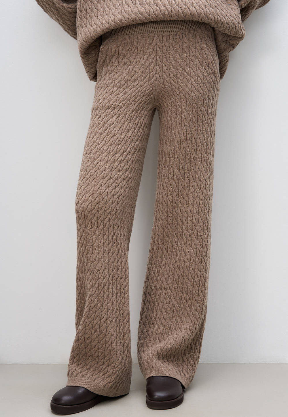 Knitted trousers with voluminous braids made from 100% extrafine merino wool. Model with elastic band and deep side pockets.