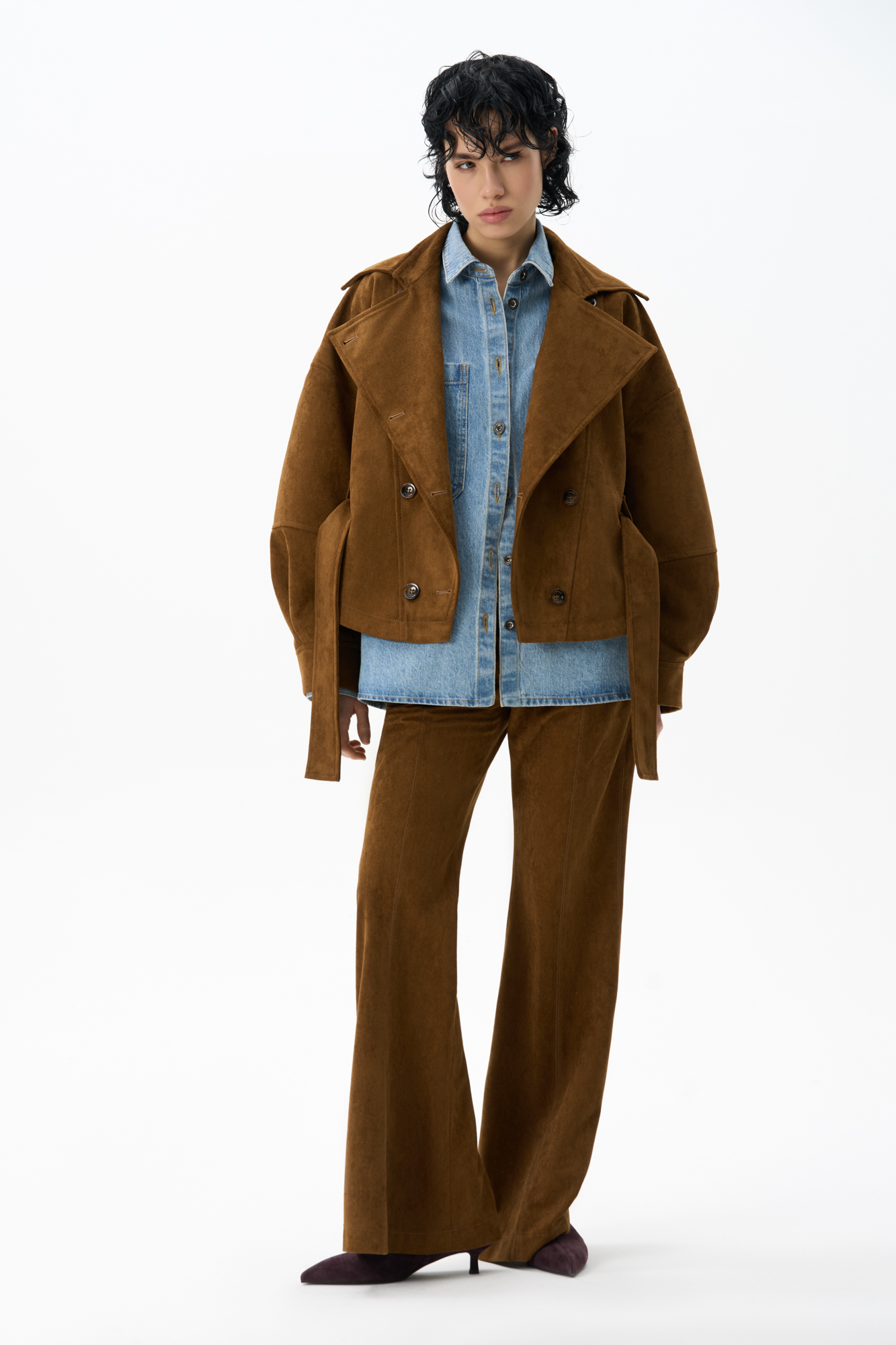 Trousers made of fabric with an imitation of the appearance and properties of natural suede. Straight fit model with belt loops, side pockets, back pockets and creases. Button and zip fastening. Finished with tone-on-tone stitching.