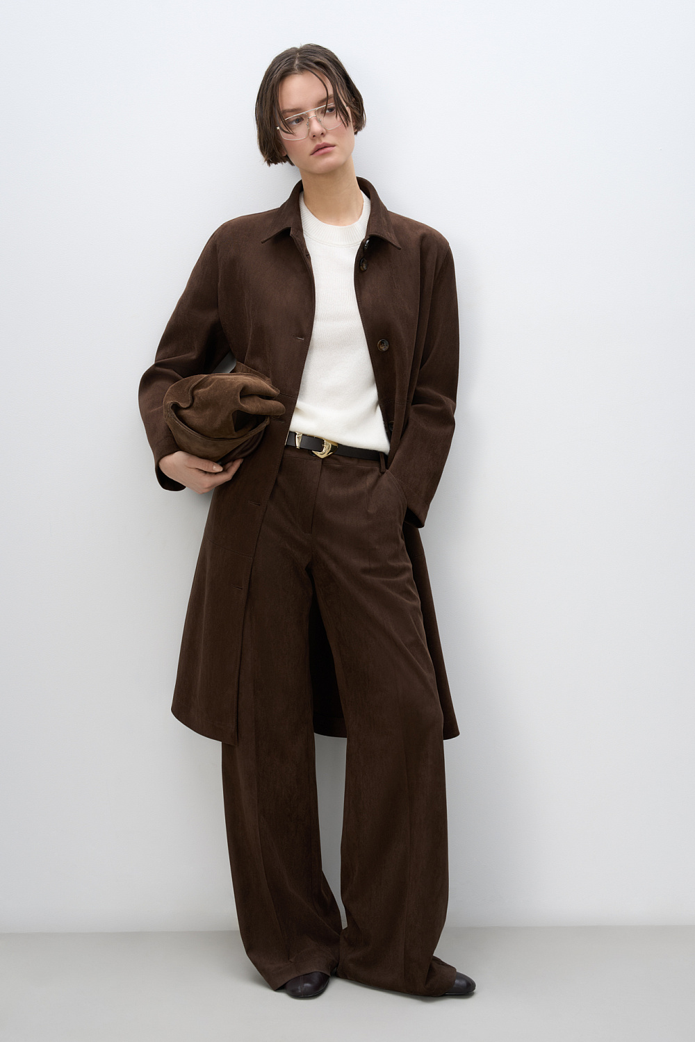 Trousers made of fabric with an imitation of the appearance and properties of natural suede. Straight fit model with belt loops, side pockets, back pockets and creases. Button and zip fastening. Finished with tone-on-tone stitching.