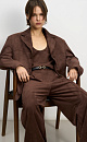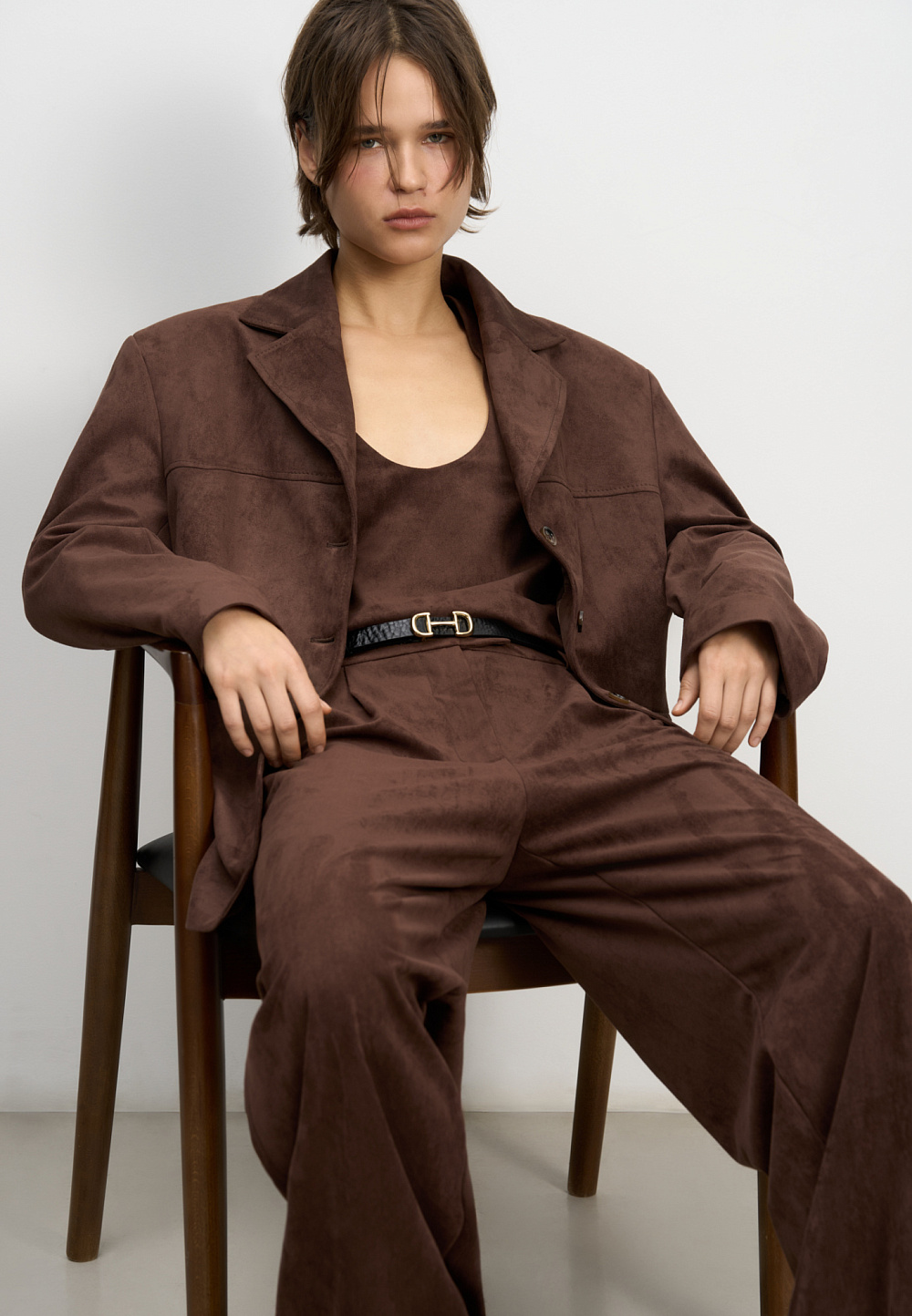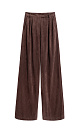 Trousers made of fabric with an imitation of the appearance and properties of natural suede. Model with pintucks at the waist and belt loops on the waistband. Fastening with hidden button and trouser hook. Finished with tone-on-tone stitching.