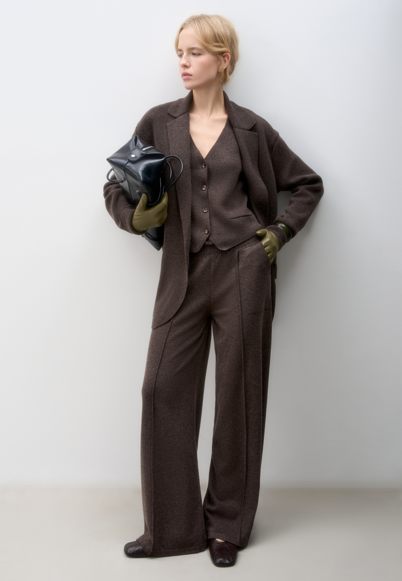Knitted wool blend trousers. Relaxed silhouette with a mid rise, side pockets and creases. Elastic waistband with ribbed drawstring.