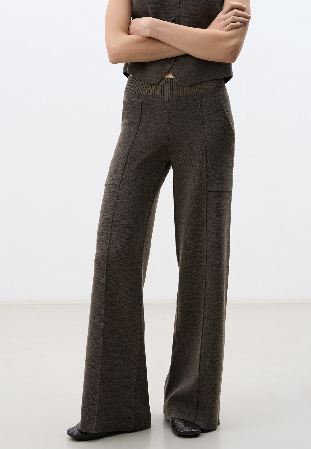 Knitted trousers with a merino wool base. Loose silhouette model with arrows, side pockets and elastic waistband. You can complement the look with a complete vest and bomber jacket.