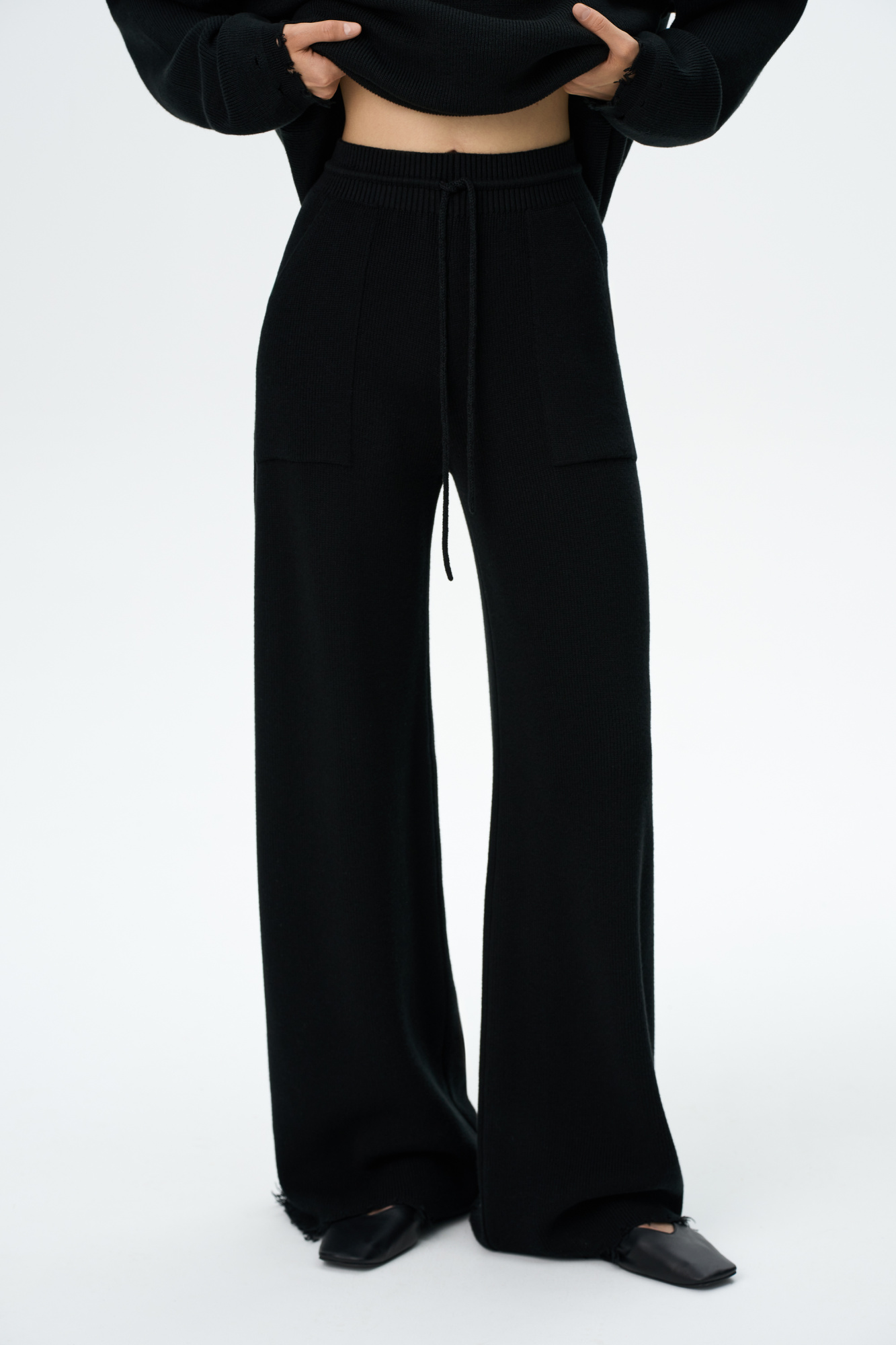 Loose pants with raw hem. Features straight silhouette with patch pockets and an elastic ribbed waistband with a drawstring.