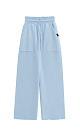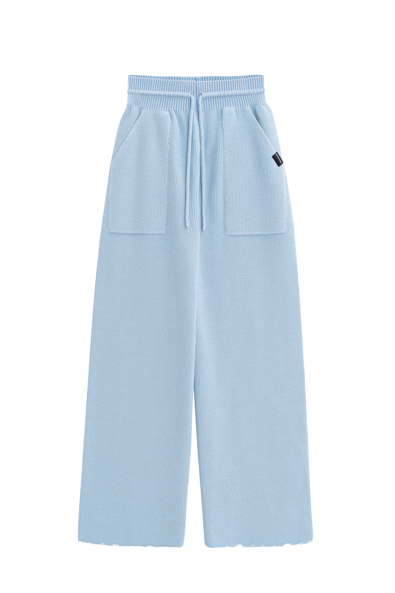Loose trousers with raw hem. The model has a straight silhouette with patch pockets and an elastic ribbed waistband with a drawstring.