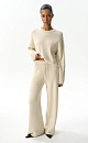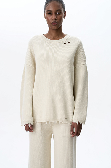Loose pants with raw hem. Features straight silhouette with patch pockets and an elastic ribbed waistband with a drawstring.