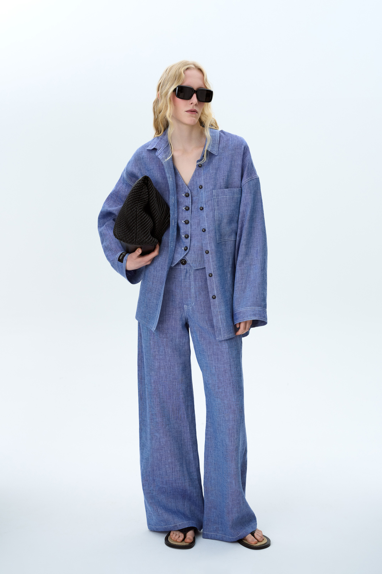 Linen jeans. Straight cut silhouette with slight flare. Five pockets. Zip and metal button closure. You can complete the look with a vest in the same style.