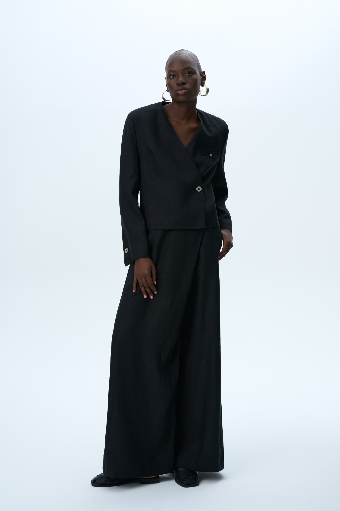 Straight wrap pants. Loose silhouette with side pockets and button closure. You can complement the look with a blazer in the same style.