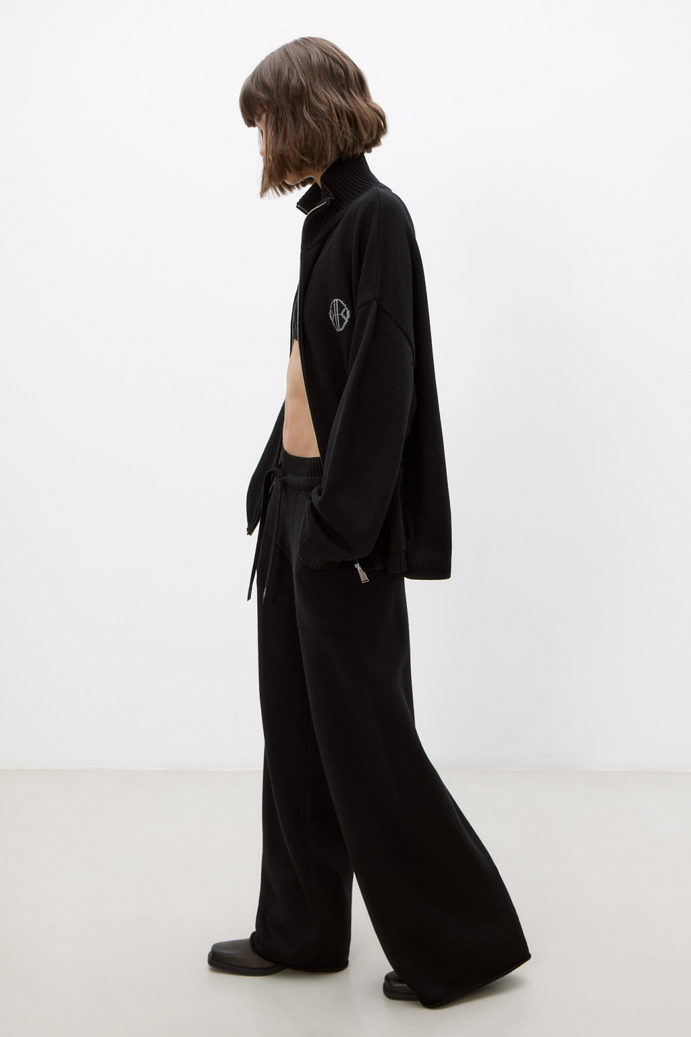 Knitted cashmere and wool trousers. The model has a straight silhouette with patch pockets and an elastic ribbed waistband with a drawstring. You can complement the look with a bomber jacket.