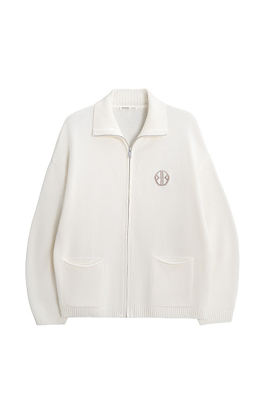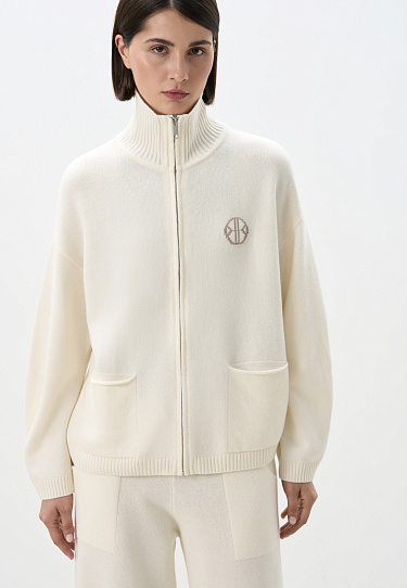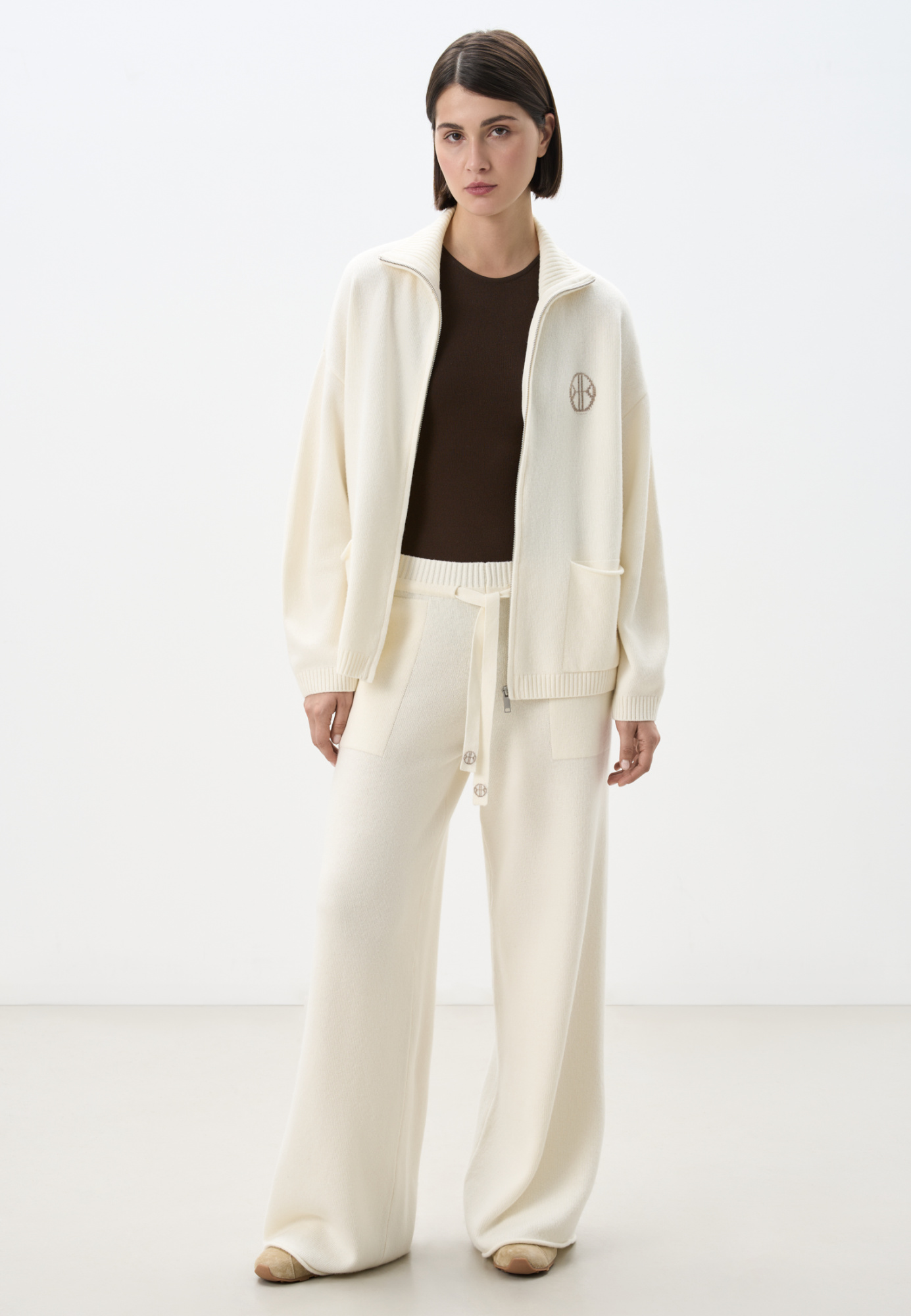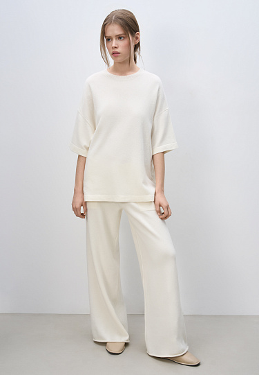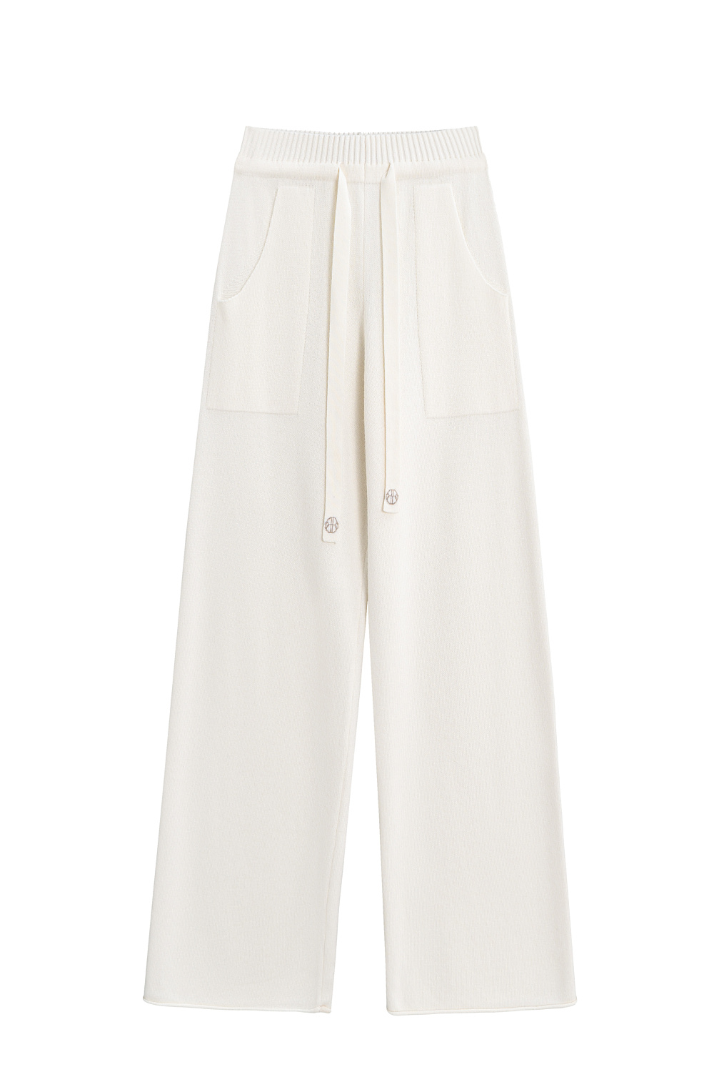Knitted cashmere and wool trousers. The model has a straight silhouette with patch pockets and an elastic ribbed waistband with a drawstring. You can complement the look with a bomber jacket.