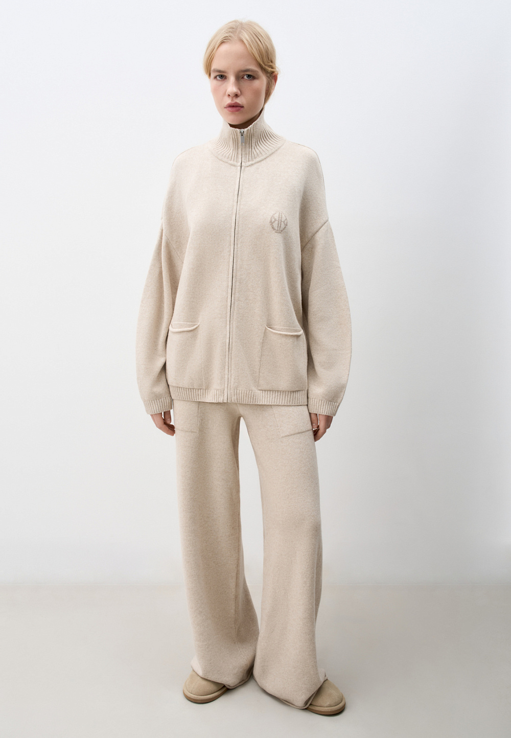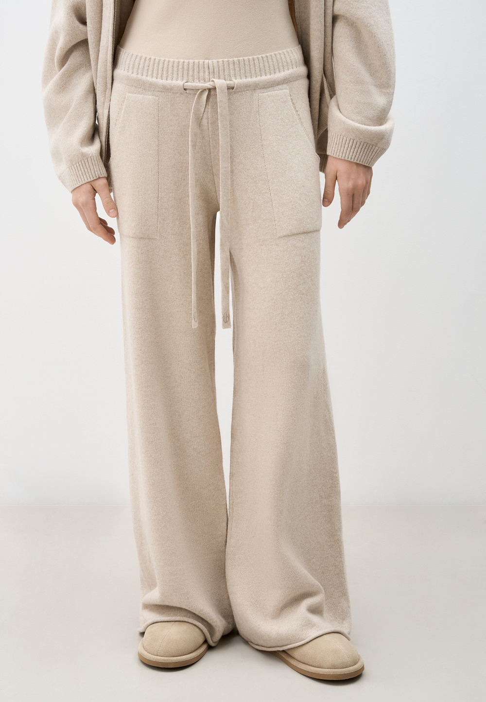 Knitted cashmere and wool trousers. The model has a straight silhouette with patch pockets and an elastic ribbed waistband with a drawstring. You can complement the look with a bomber jacket.
