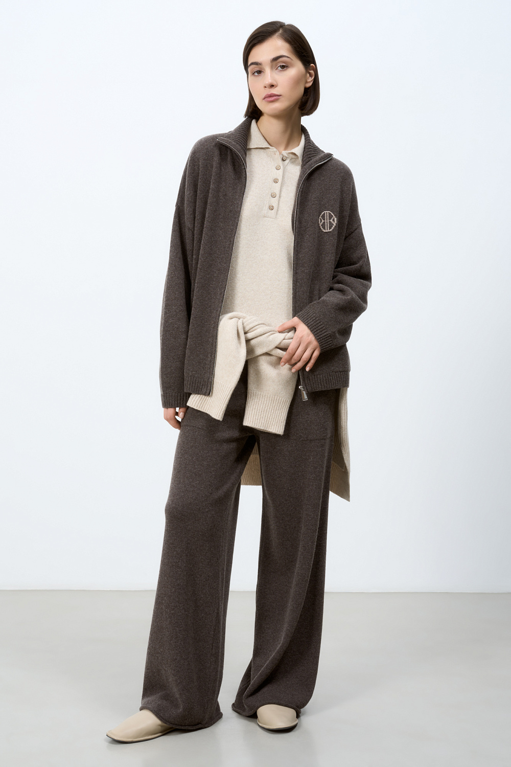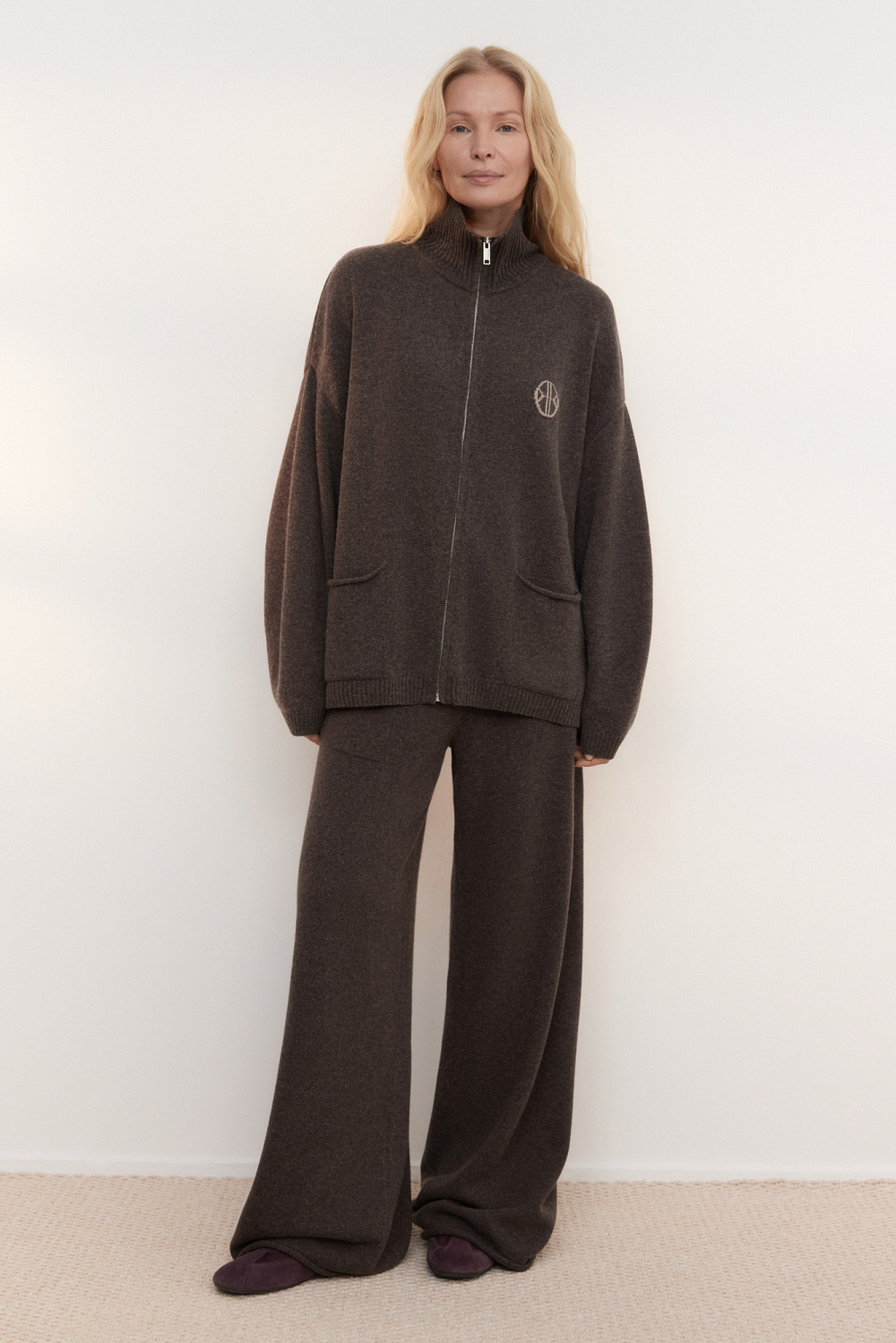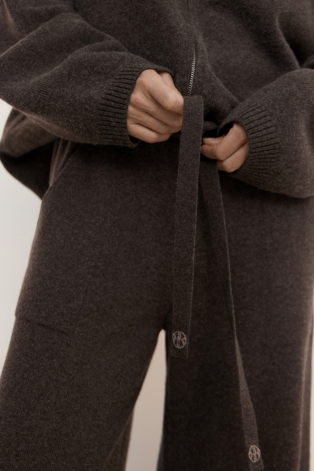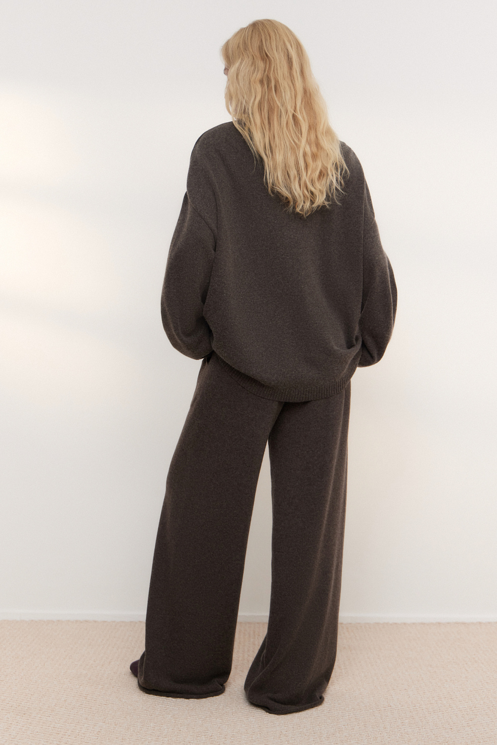 Knitted cashmere and wool trousers. The model has a straight silhouette with patch pockets and an elastic ribbed waistband with a drawstring. You can complement the look with a bomber jacket.