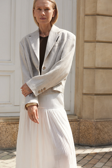 Wide-leg trousers made of 100% linen with a high waist. Straight cut model with pin tucks and side pockets. Belt loops on the waistband. Fastening with a zipper and two buttons.