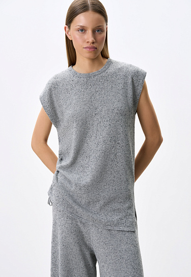 Knitted melange trousers made of soft wool with the addition of silk and viscose. Model of a straight silhouette with a wide belt with a drawstring. Can be complemented with a vest made of the same yarn.