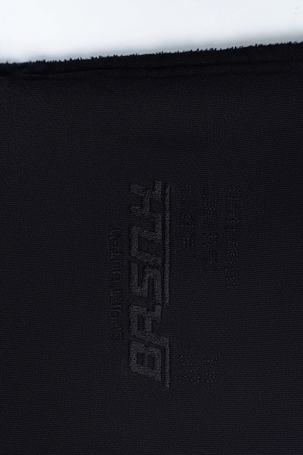 Wide sweatpants made of sweatshirt. Model with a wide belt with a drawstring and pockets. The product is decorated with an embroidered brand logo and an imitation raw edge.