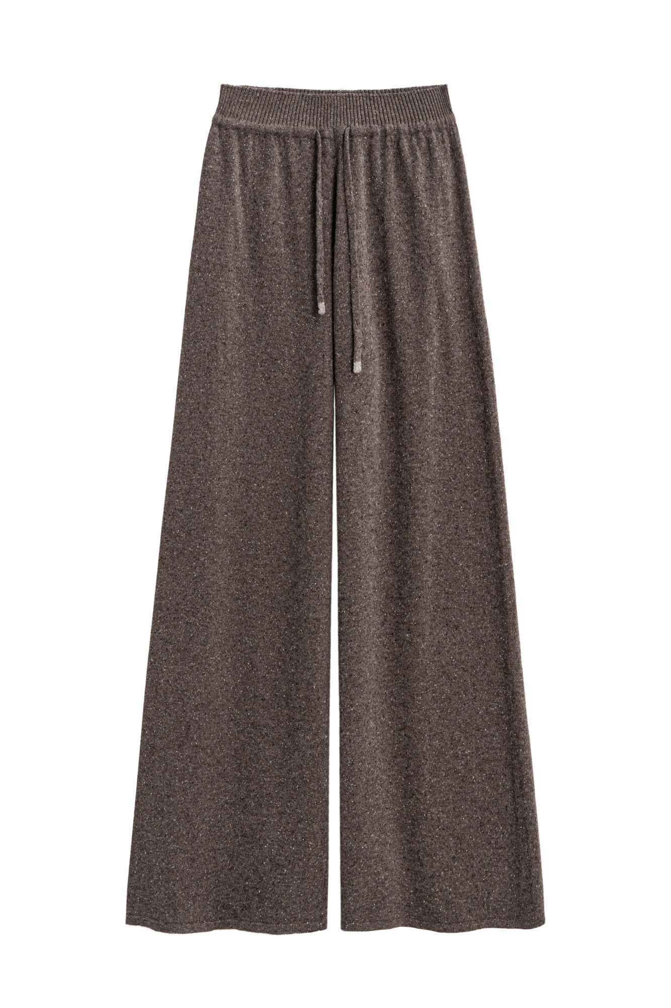 Knitted melange trousers made of soft wool with the addition of silk and viscose. Model of a straight silhouette with a wide belt with a drawstring. Can be complemented with a vest made of the same yarn.