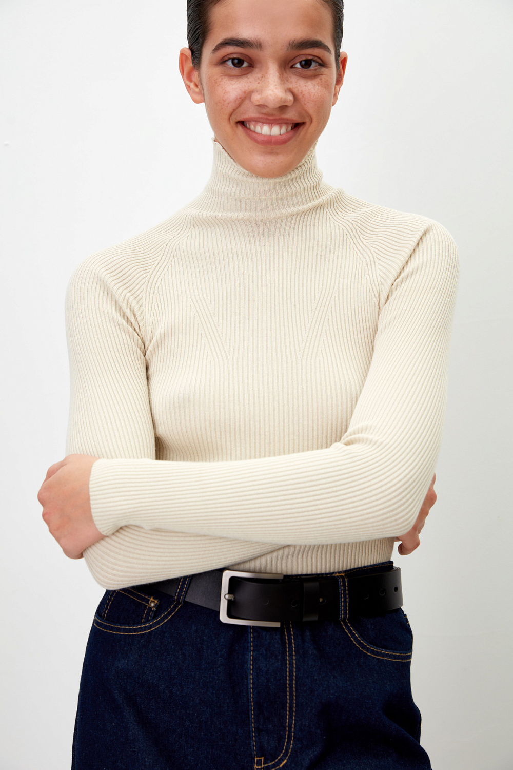 Fitted ribbed knit turtleneck with raglan sleeves.