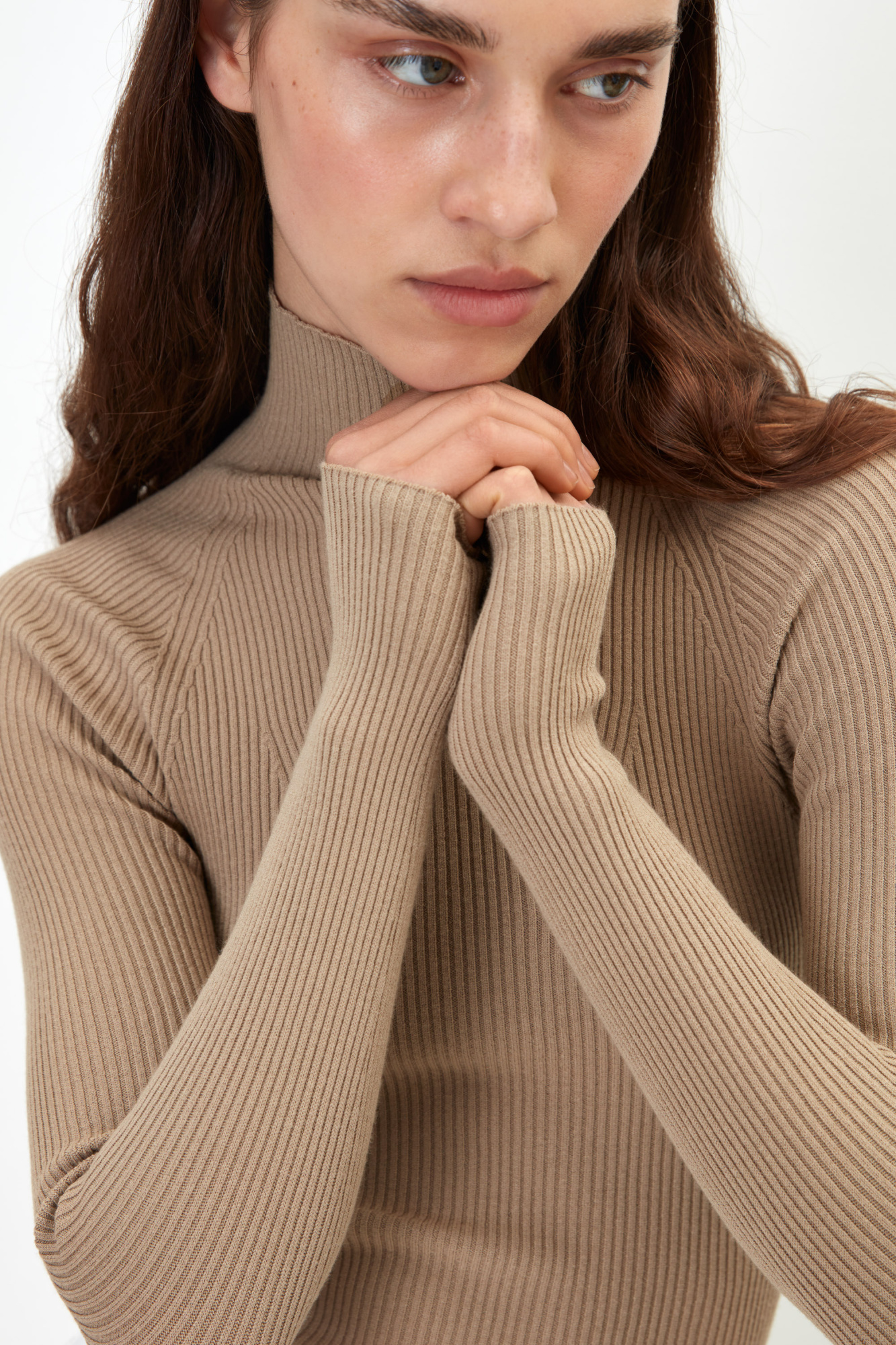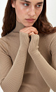 Fitted ribbed knit turtleneck with raglan sleeves.