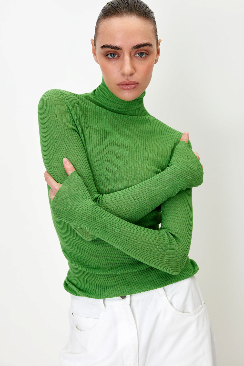 Semi-sheer seamless turtleneck in extrafine merino wool.