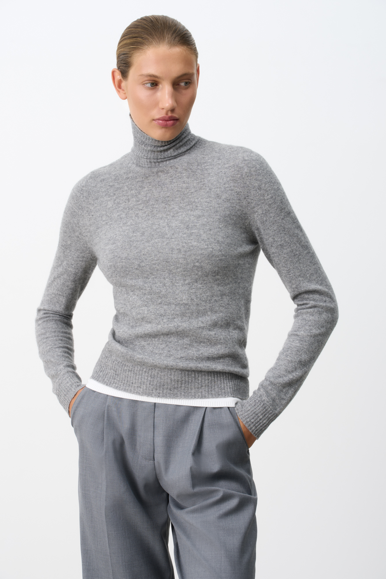 Cashmere and wool turtleneck jumper. Fitted silhouette, ribbed edges.