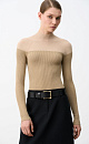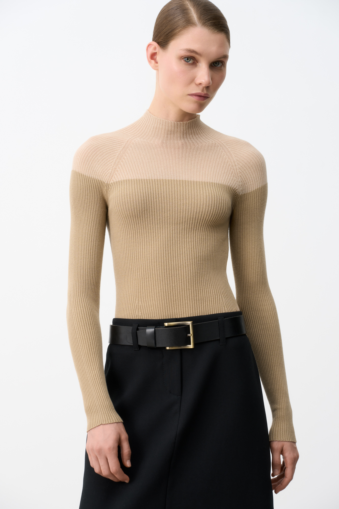 Knitted turtleneck made of fine viscose. Features semi-sheer top and thicker bottom.