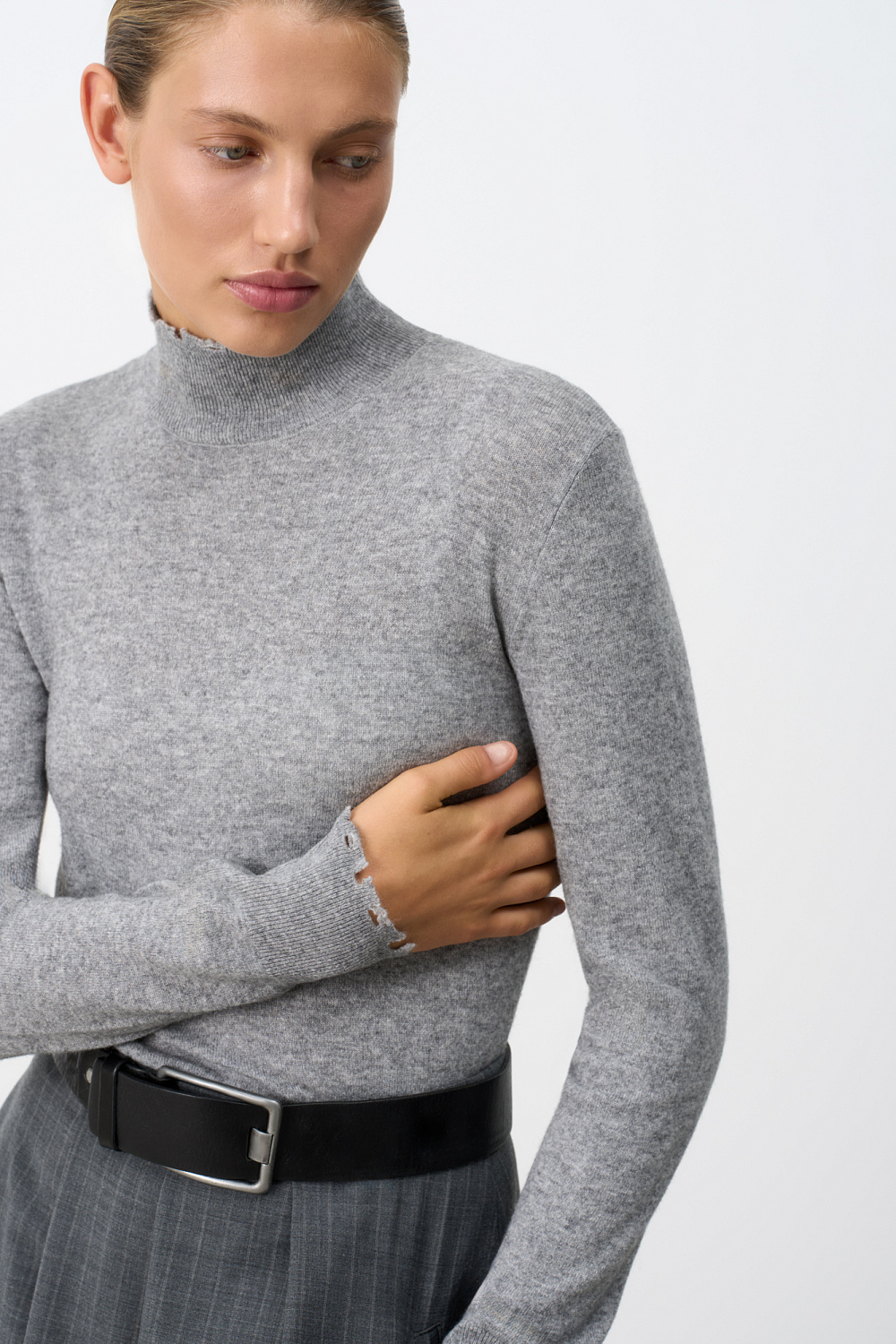 Knitted turtleneck made of wool with cashmere addition. Model of a fitted silhouette with long sleeves and a stand-up collar. Sleeve cuffs, collar and hem with torn edges.