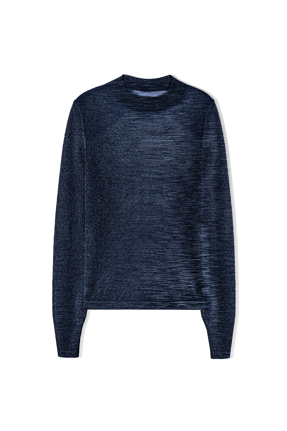 Knitted thin turtleneck made of viscose with the addition of lurex. Model with long sleeves and stand-up collar. The collar, sleeve cuffs and hem are ribbed.