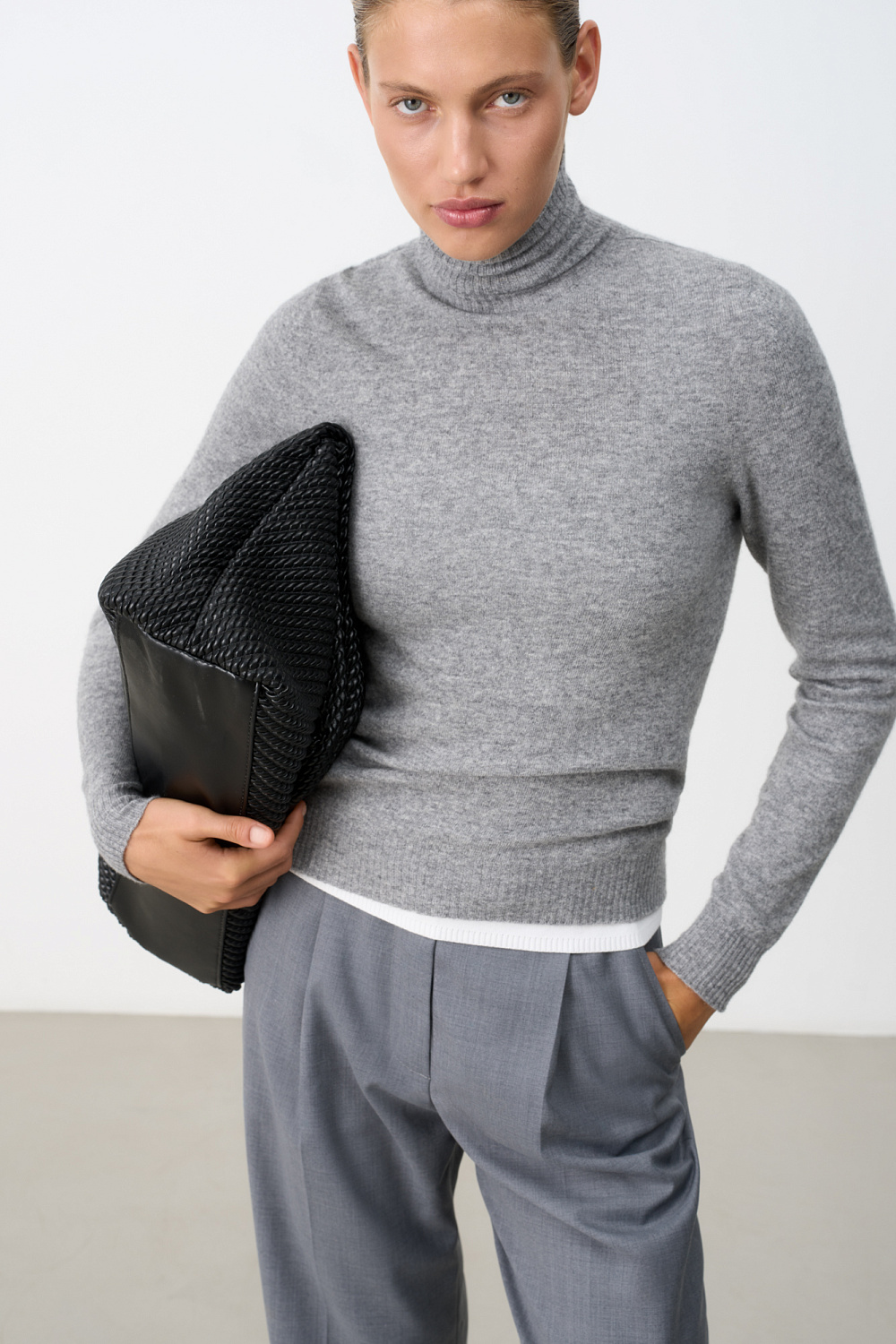 Cashmere and wool turtleneck jumper. Fitted silhouette, ribbed edges.