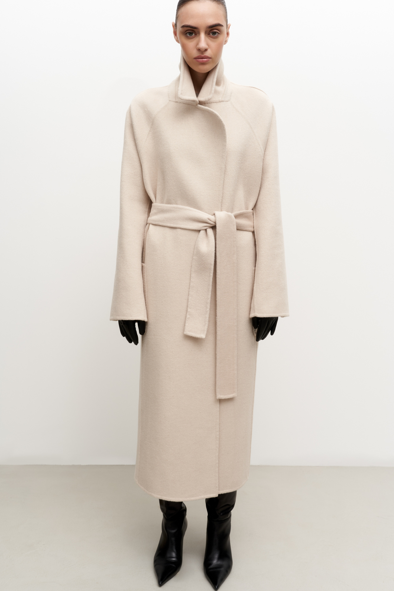 Wool blend wrap coat with tie belt. Lapel collar and patch pockets. The coat is made using double face technology, so the inside looks as neat as the outside.