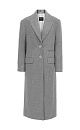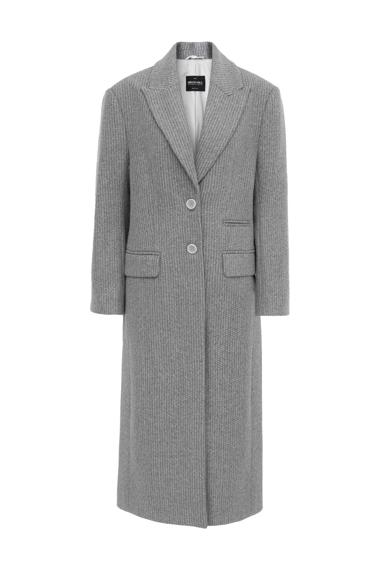 Striped classic wool coat. Peaked lapel collar, patch pockets. Front button closure.