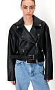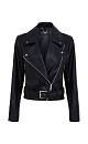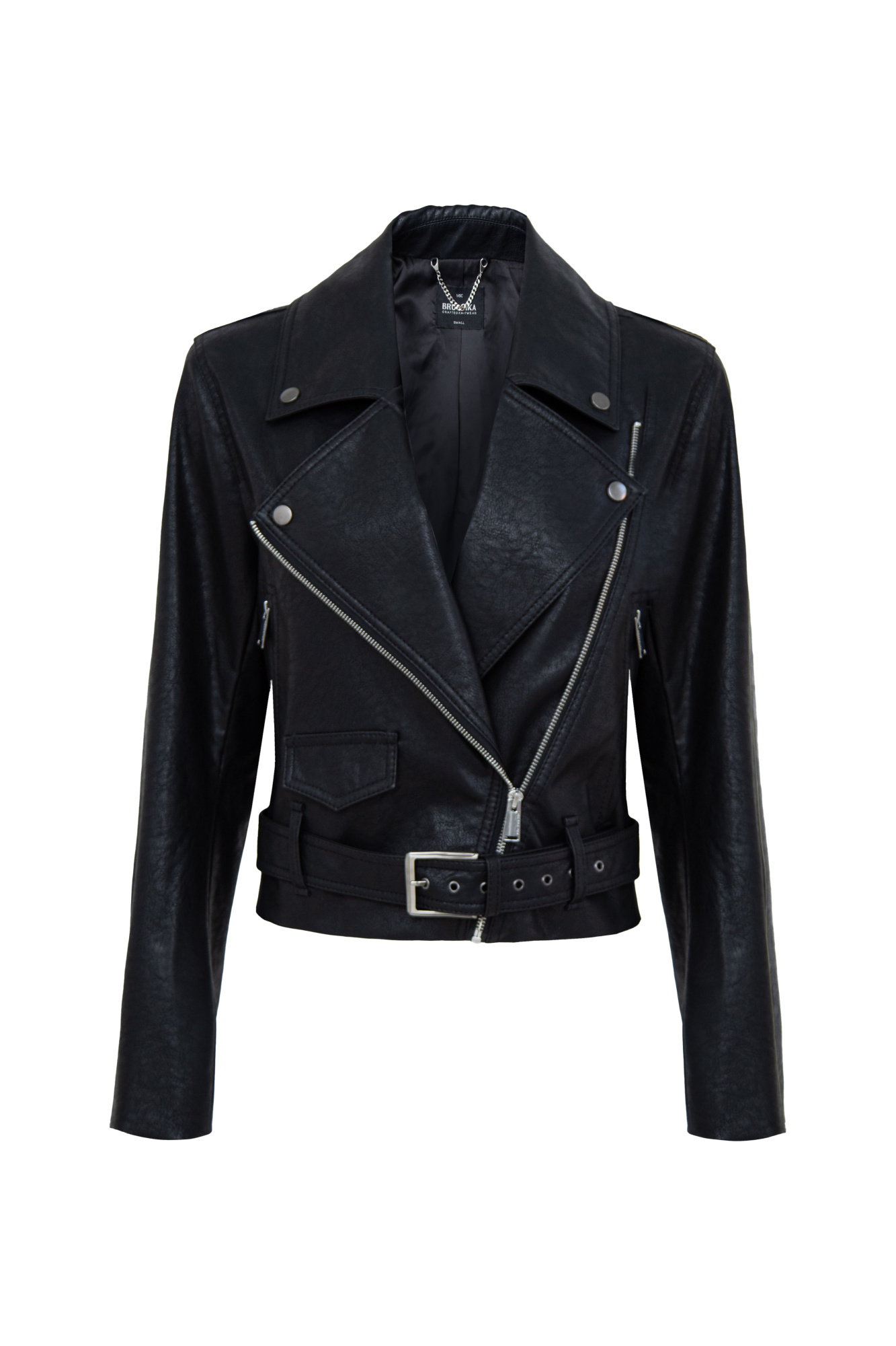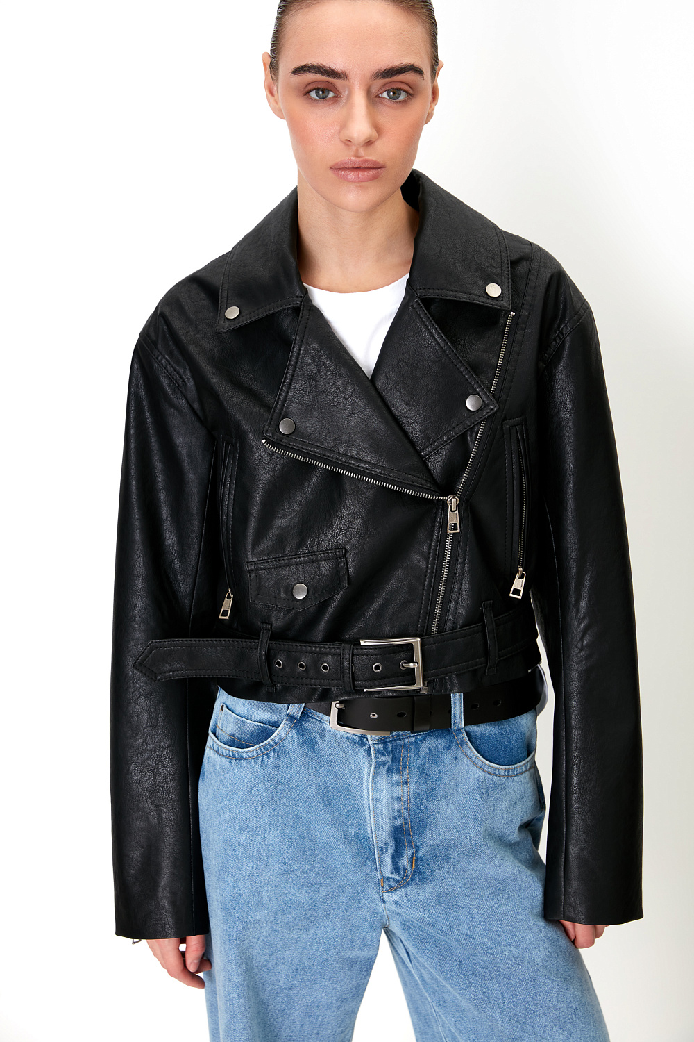 Short faux leather biker jacket with lapel collar. Side pockets with zip closure. Wide belt with metal buckle at hem. Front asymmetric zip closure. Lined.