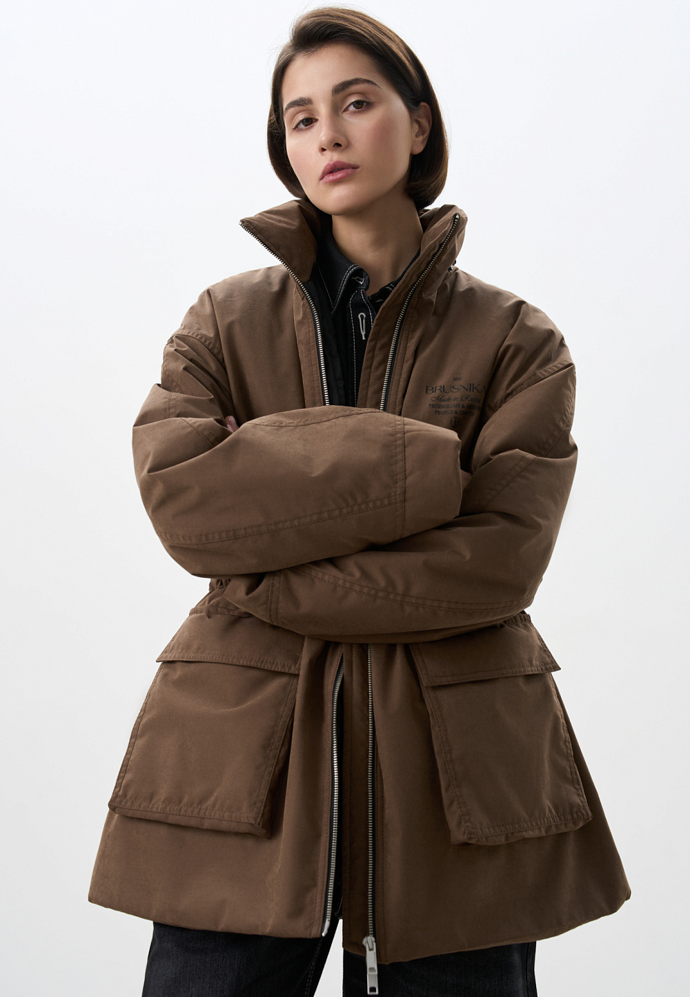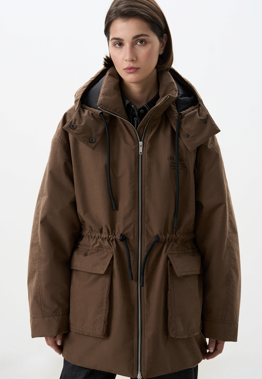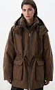 Parka with sintepon. A loose-fitting model with an adjustable drawstring at the waist, large patch pockets with flaps, a dropped shoulder line, and a stand collar. The jacket comes with an additional voluminous collar and hood. It is fastened with a zipper. The product is lined.
