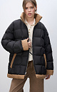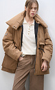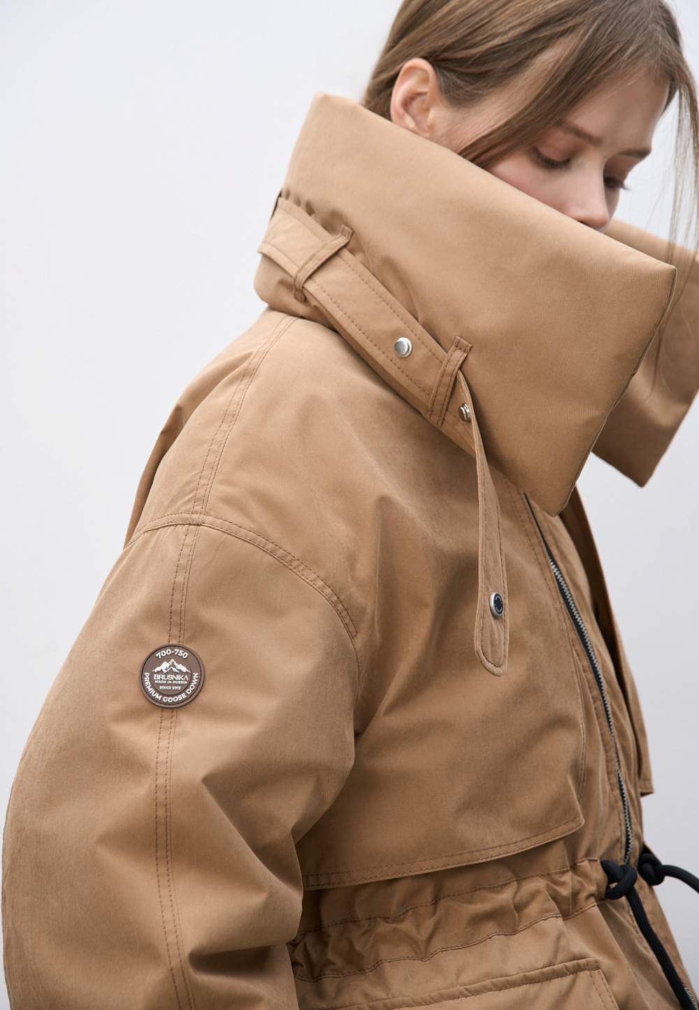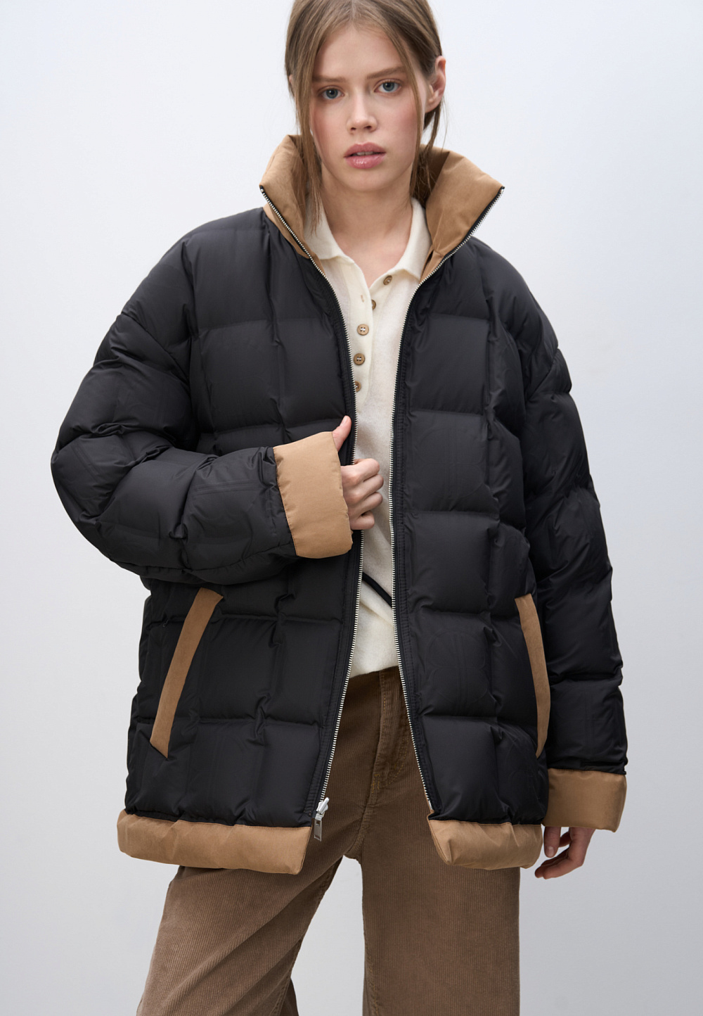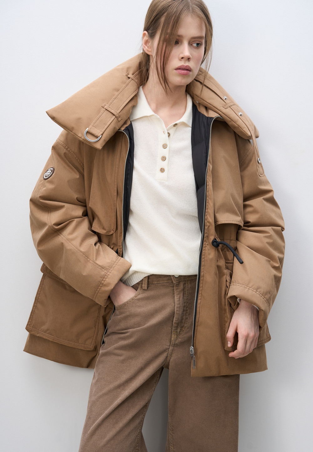 Reversible down jacket. Loose silhouette model with an adjustable drawstring at the waist, large patch pockets with flaps and a stand-up collar. The jacket comes with an additional voluminous collar and hood. Zip closure.