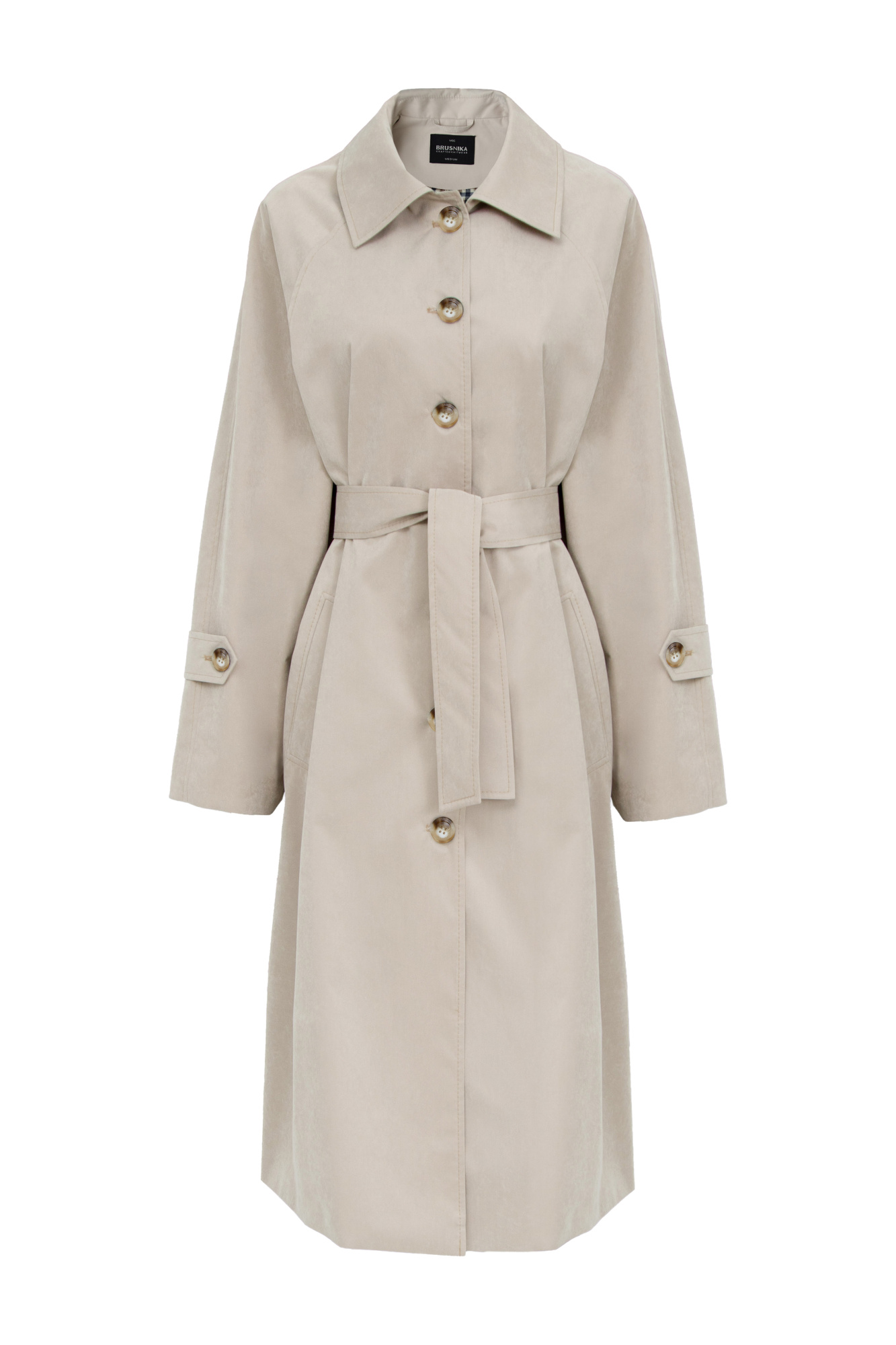 Oversized trench coat with zippered side slits and pockets. Checked lining and wide tonal belt. Long sleeves with belted cuffs. Button closure.