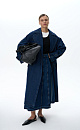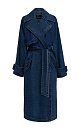 Double-breasted oversize wrap denim trench coat without lining. Asymmetrical yoke, turn-down collar and wide belt made of basic material. Front side pockets with buttons.