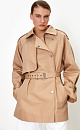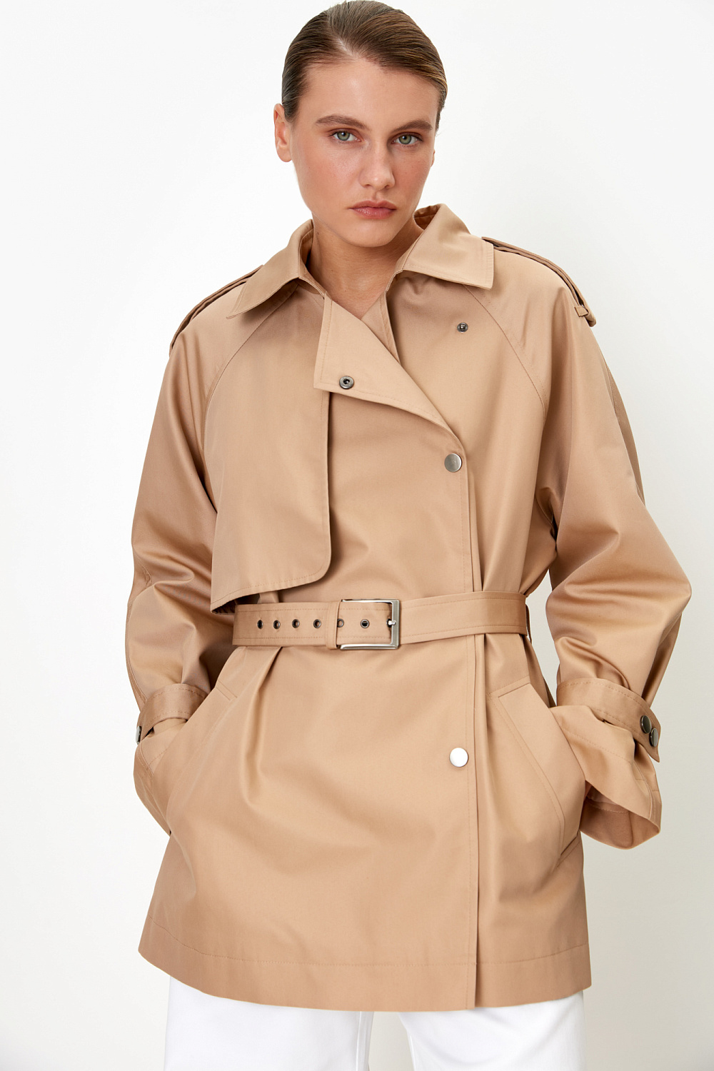 Short trench coat with lapel collar. Features loose fit silhouette, detachable tie belt at the waist, an asymmetrical flap and side pockets. Long sleeves with belted cuffs and epaulettes. Lined.